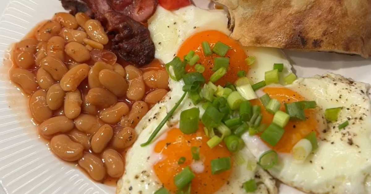 Disposez tous les ingrédients dans une assiette : œufs juteux, bacon croustillant, haricots chauds, pain parfumé et tomates fraîches. Parsemez d’oignons verts finement hachés. Ce petit-déjeuner vous donnera l’énergie nécessaire pour toute la journée.