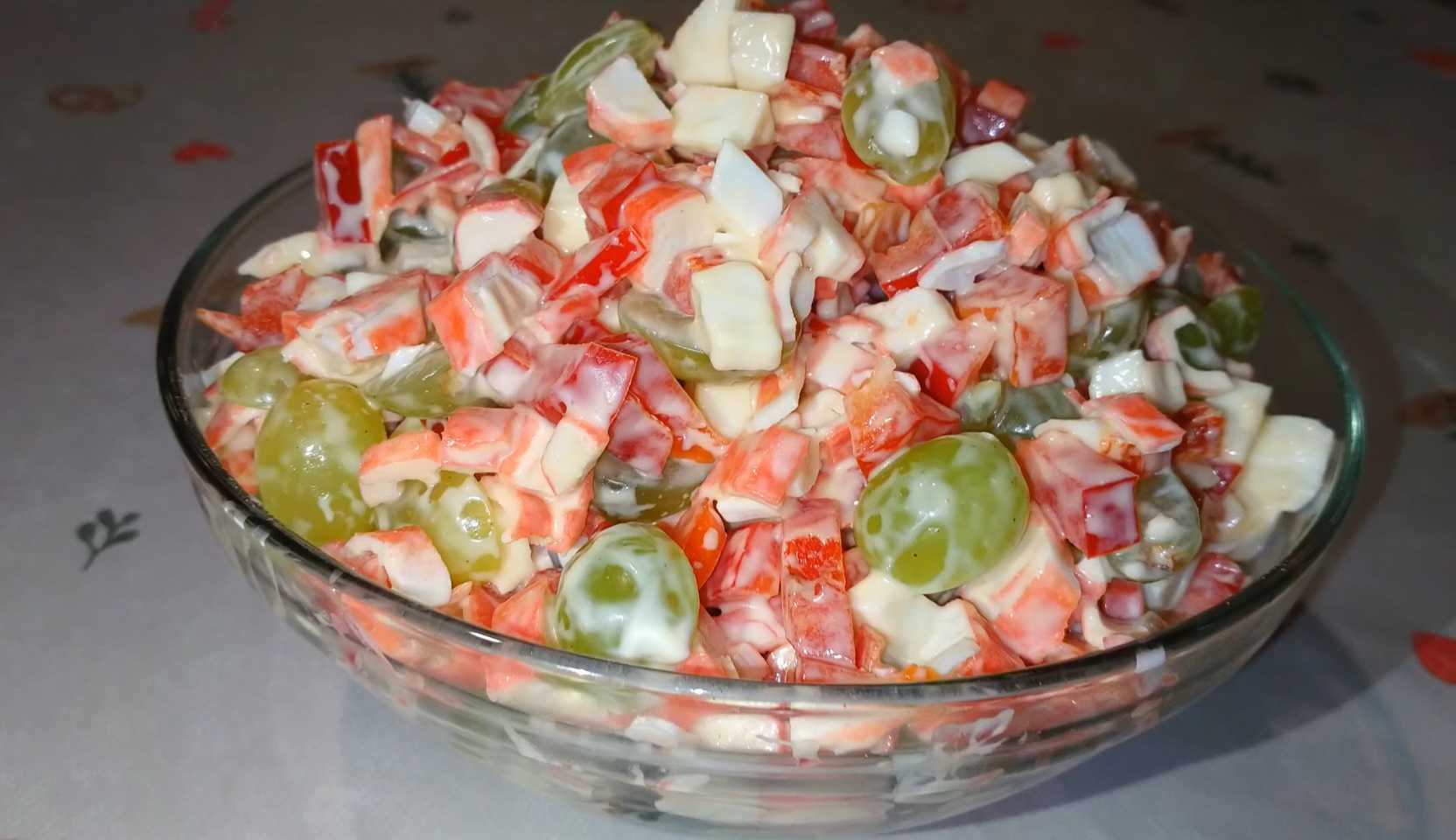 Salade de crabe aux raisins Ce plat associe des saveurs inattendues. Les raisins se marient à merveille avec les bâtonnets de crabe, tandis que le poivron rouge apporte fraîcheur et croquant. Simple et pourtant savoureux, ce plat est idéal pour un repas de fête.