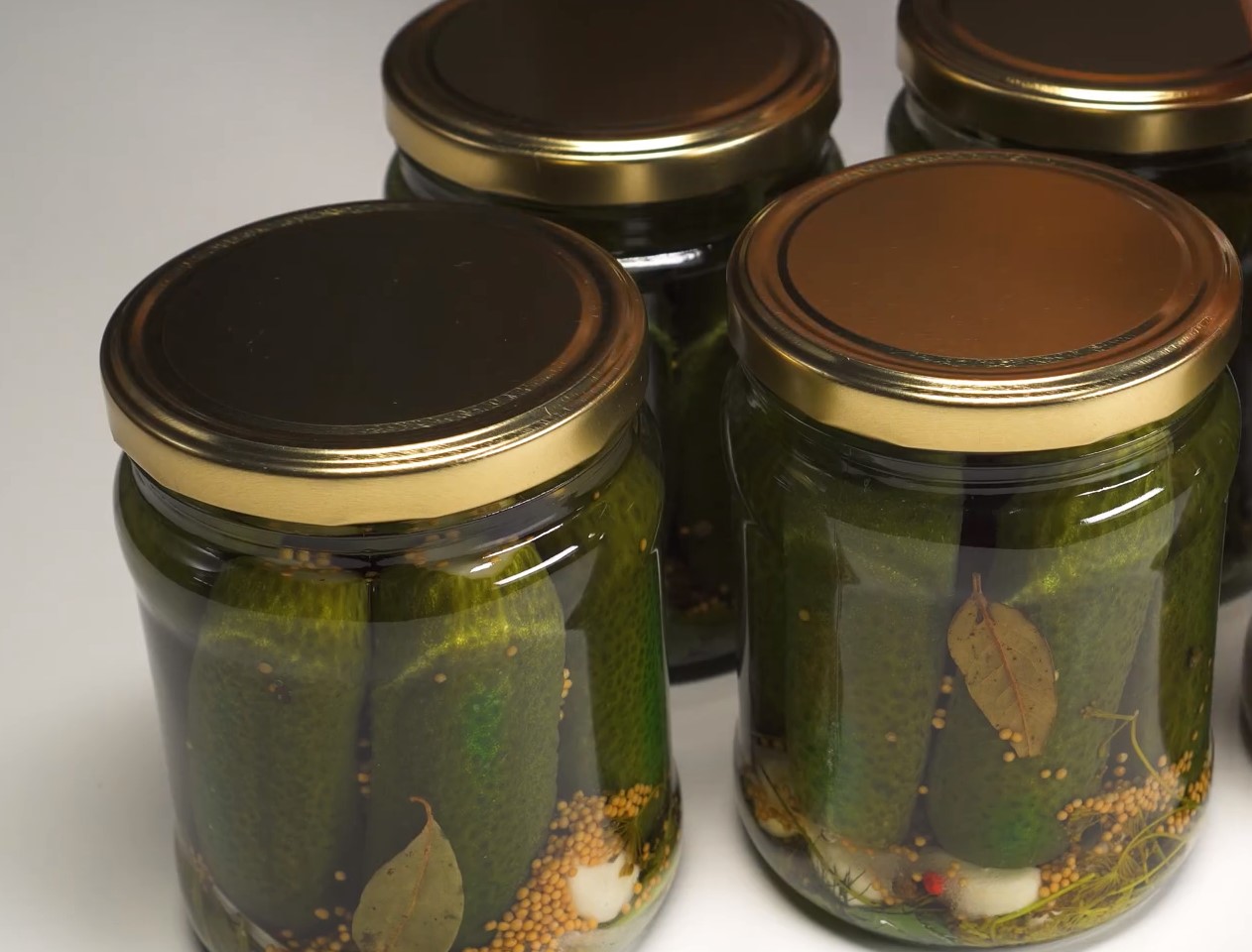 Cornichons – Un classique des conserves d'hiver. Croquantes, aromatiques et d'une saveur parfaitement équilibrée, elles agrémentent à merveille tous vos plats. Pour préparer ces concombres, il vous faudra de petits concombres frais, de l'aneth, de l'ail, des feuilles de cerisier et de groseille, ainsi que des épices comme des grains de poivre et des feuilles de laurier.