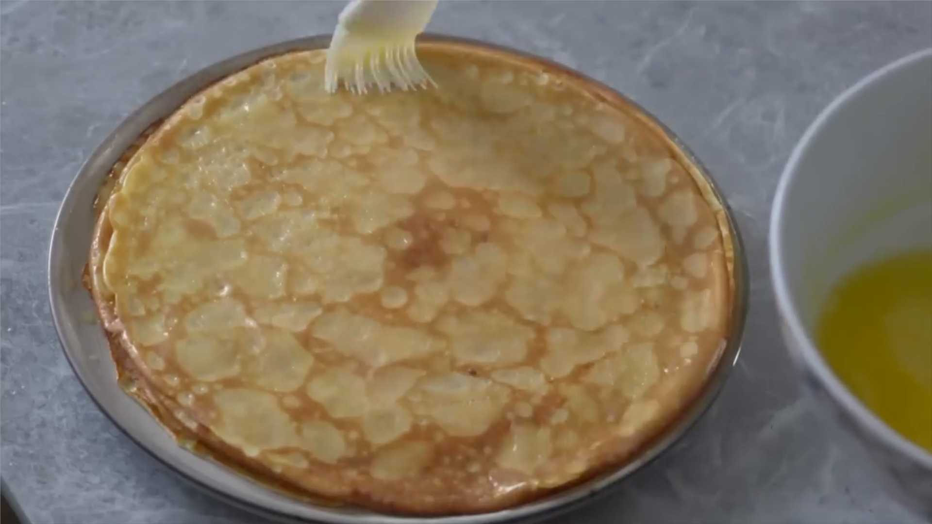 Déposez la crêpe cuite sur une assiette et badigeonnez-la de beurre.