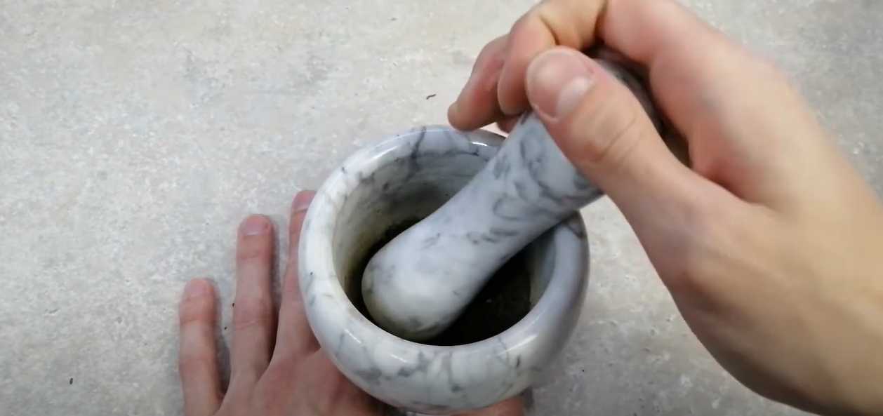 Écrasez un comprimé de thé vert chinois pressé dans un mortier.