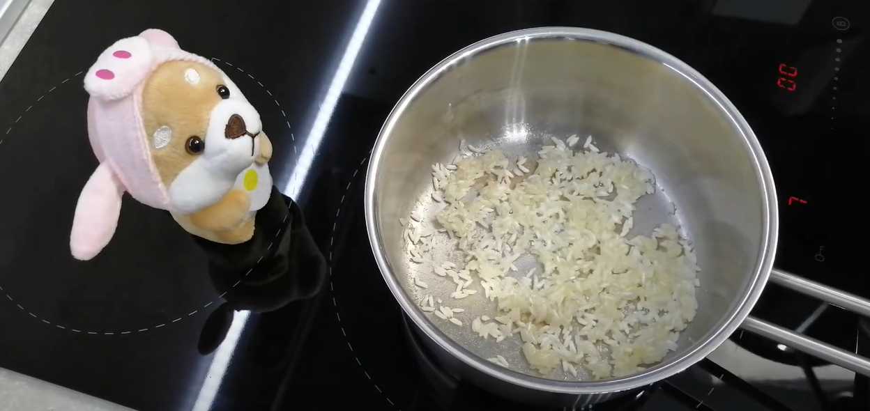 Faire fondre le beurre dans une casserole, ajouter le riz et la farine et faire revenir légèrement.