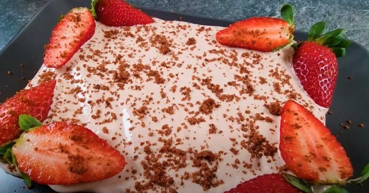 Décorez les coins du gâteau avec des demi-fraises coupées en tranches et des miettes.