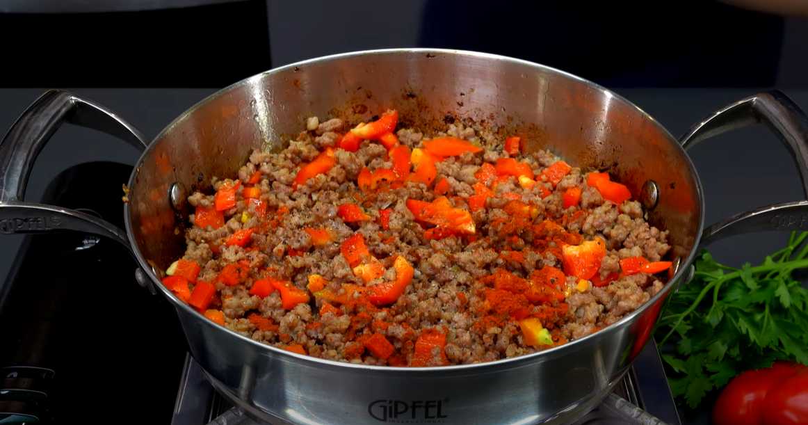 Hachez finement le poivron, ajoutez-le à la viande et mélangez.