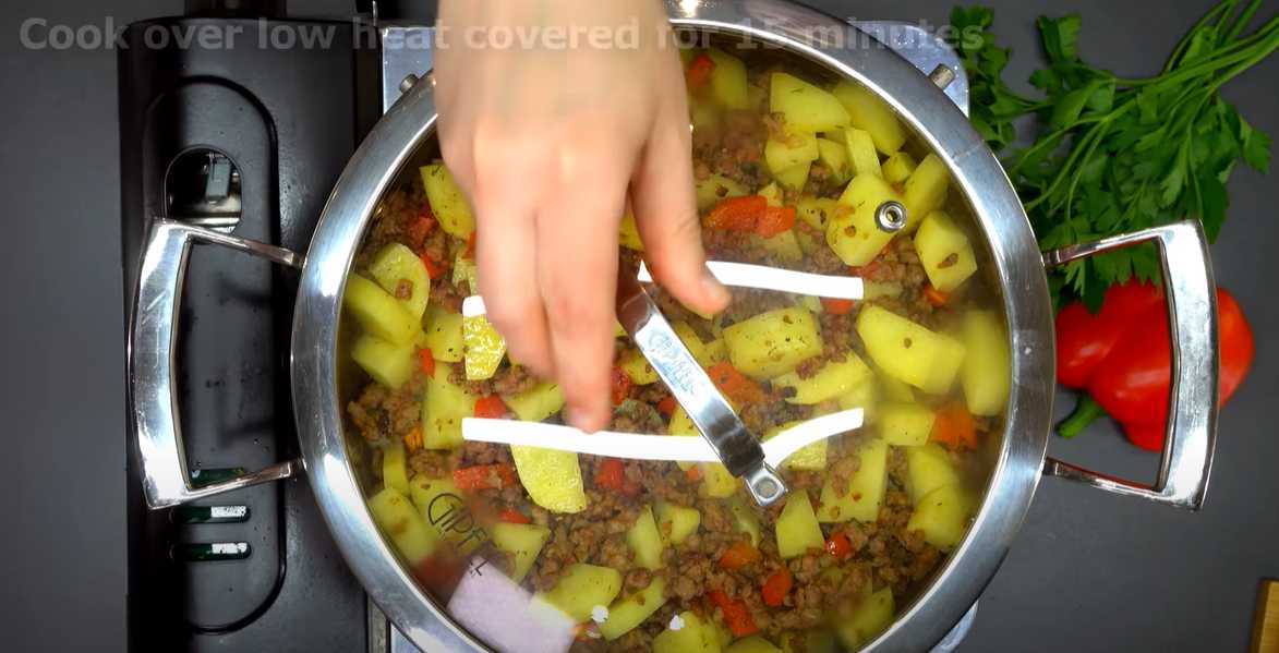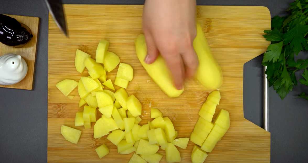 Coupez 3 grosses pommes de terre pelées en petits morceaux. Ajoutez-les à la viande.