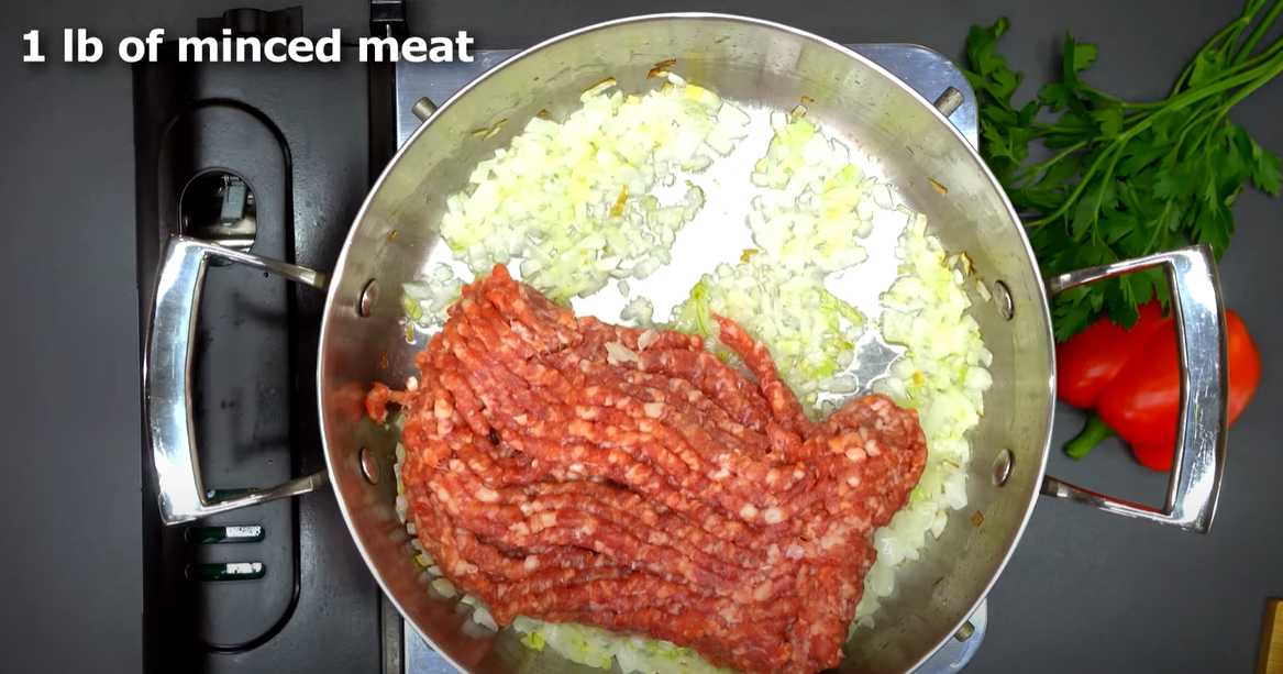Mettez 450 g de bœuf haché dans la poêle, remuez et faites cuire pendant 5 minutes, en remuant, jusqu'à ce que la viande soit dorée.