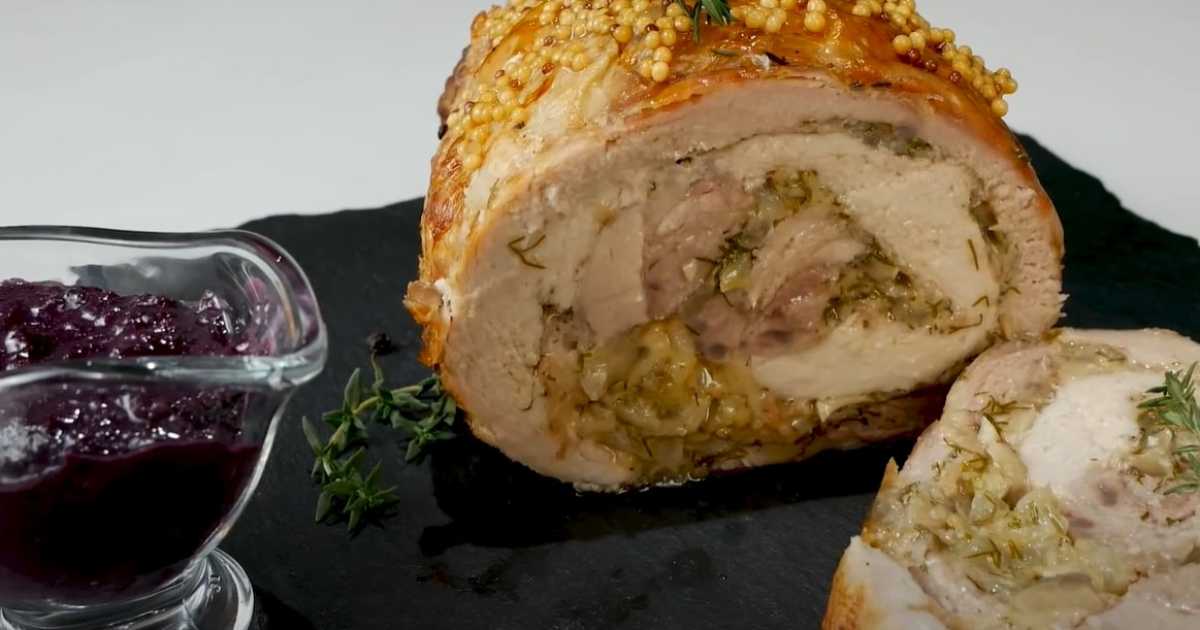 Le pain de viande se prépare partout dans le monde depuis l'Antiquité. On le fait souvent avec de la viande hachée et diverses garnitures, mais il est bien plus simple d'utiliser une tranche entière de porc tendre et savoureux, de l'assaisonner, d'y envelopper la garniture et de la faire cuire au four. Et qui dit viande dit vin rouge – ou sauce au vin.