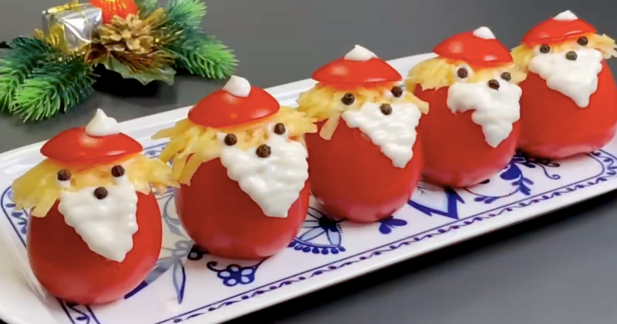 Fixez les couvercles de tomates sur le dessus pour former des chapeaux. Décorez les chapeaux avec de petites gouttes de mayonnaise pour créer des pompons. Servez immédiatement.