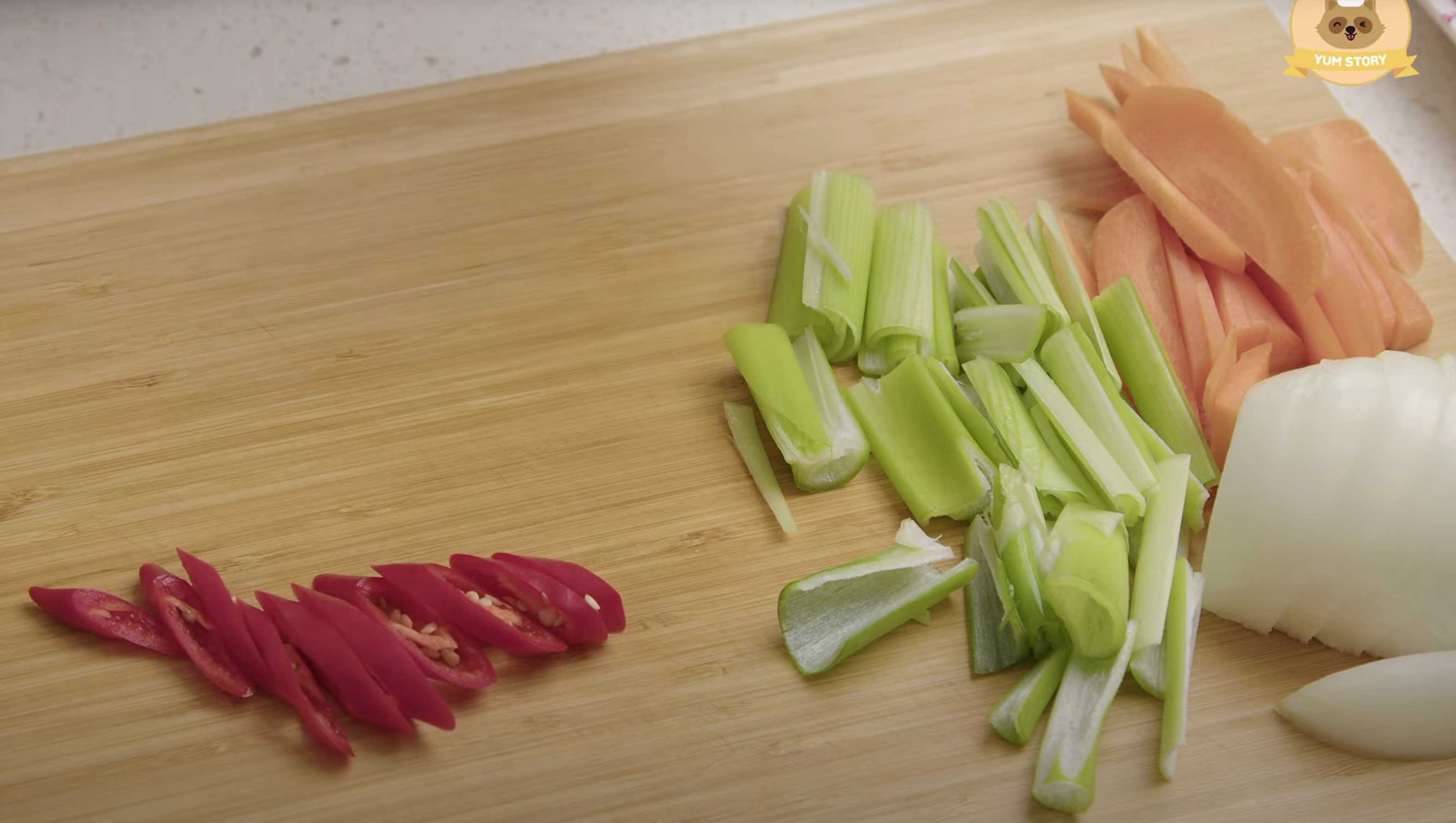 Coupez un demi-oignon en demi-rondelles épaisses, une demi-carotte en tranches longitudinales, la partie blanche de deux pousses d'oignon vert en fines lanières et le piment en rondelles légèrement en diagonale.