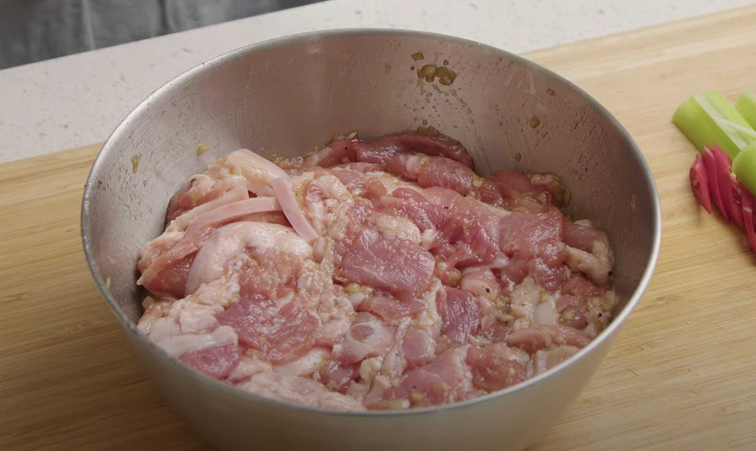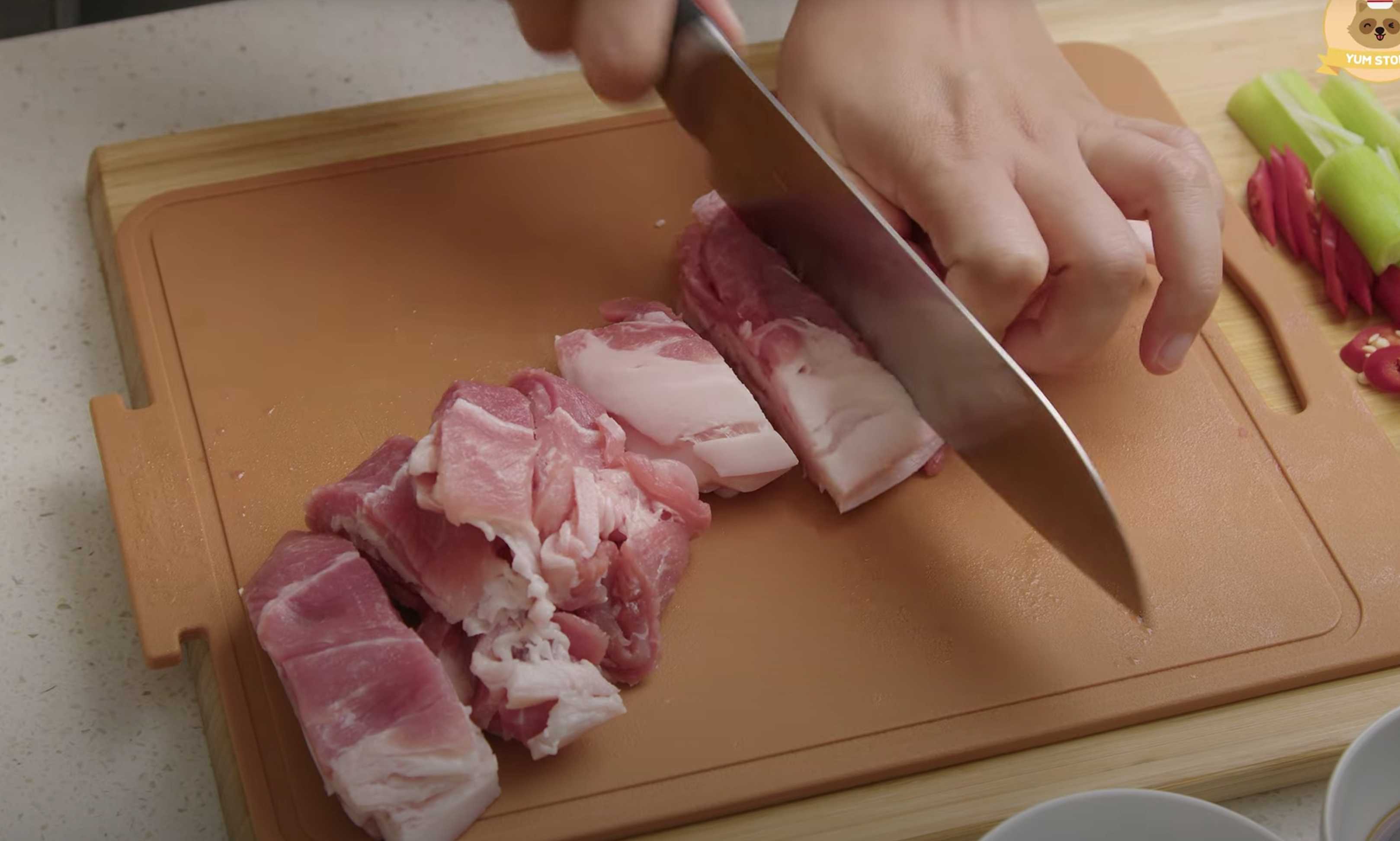 Coupez le porc en petits morceaux.