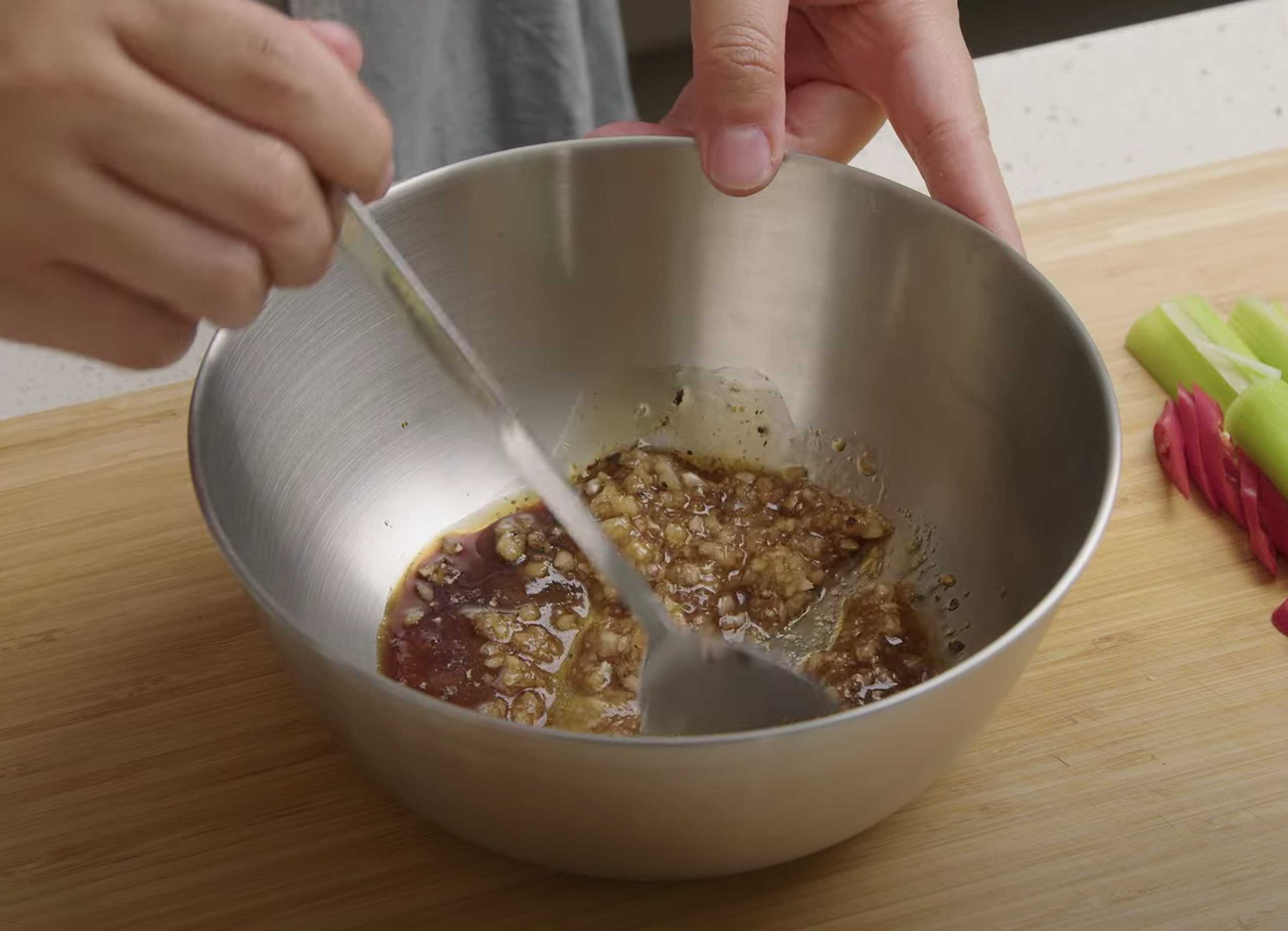 Mettez une cuillère à soupe d'ail écrasé dans un bol, ajoutez 3 cuillères à soupe de sauce soja, 2 cuillères à soupe de sucre, une cuillère à soupe d'huile de sésame, du poivre noir selon votre goût et mélangez.
