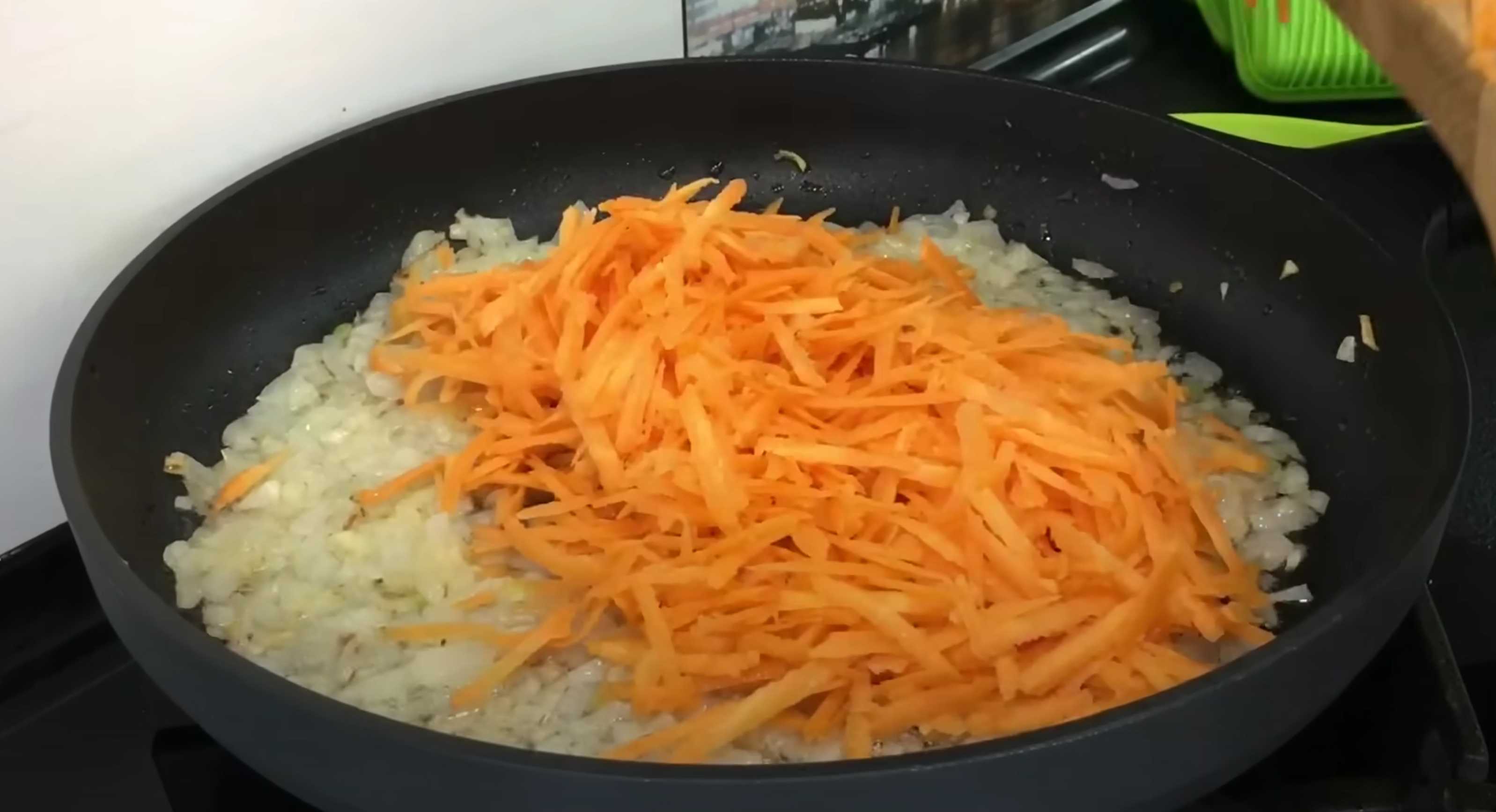Râpez les carottes avec une râpe à gros trous, ajoutez-les à l'oignon et faites-les revenir à feu moyen pendant encore 10 minutes.