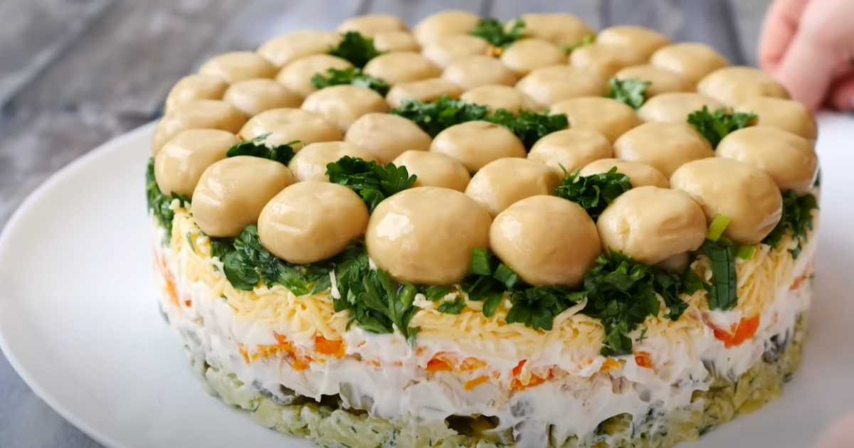 Des champignons savoureux, du poulet tendre et une présentation soignée : la salade « Clairière aux champignons » sera la star de votre table de fêtes. Cette délicieuse et copieuse salade de champignons est facile à préparer et impressionne par sa présentation originale. La recette utilise des champignons marinés, du poulet bouilli, du fromage et d'autres ingrédients faciles à trouver.