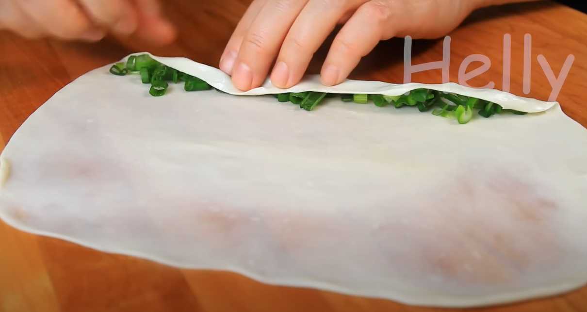 Hachez les oignons verts, disposez-les le long du bord le plus long du rectangle, enroulez-les et roulez-les.
