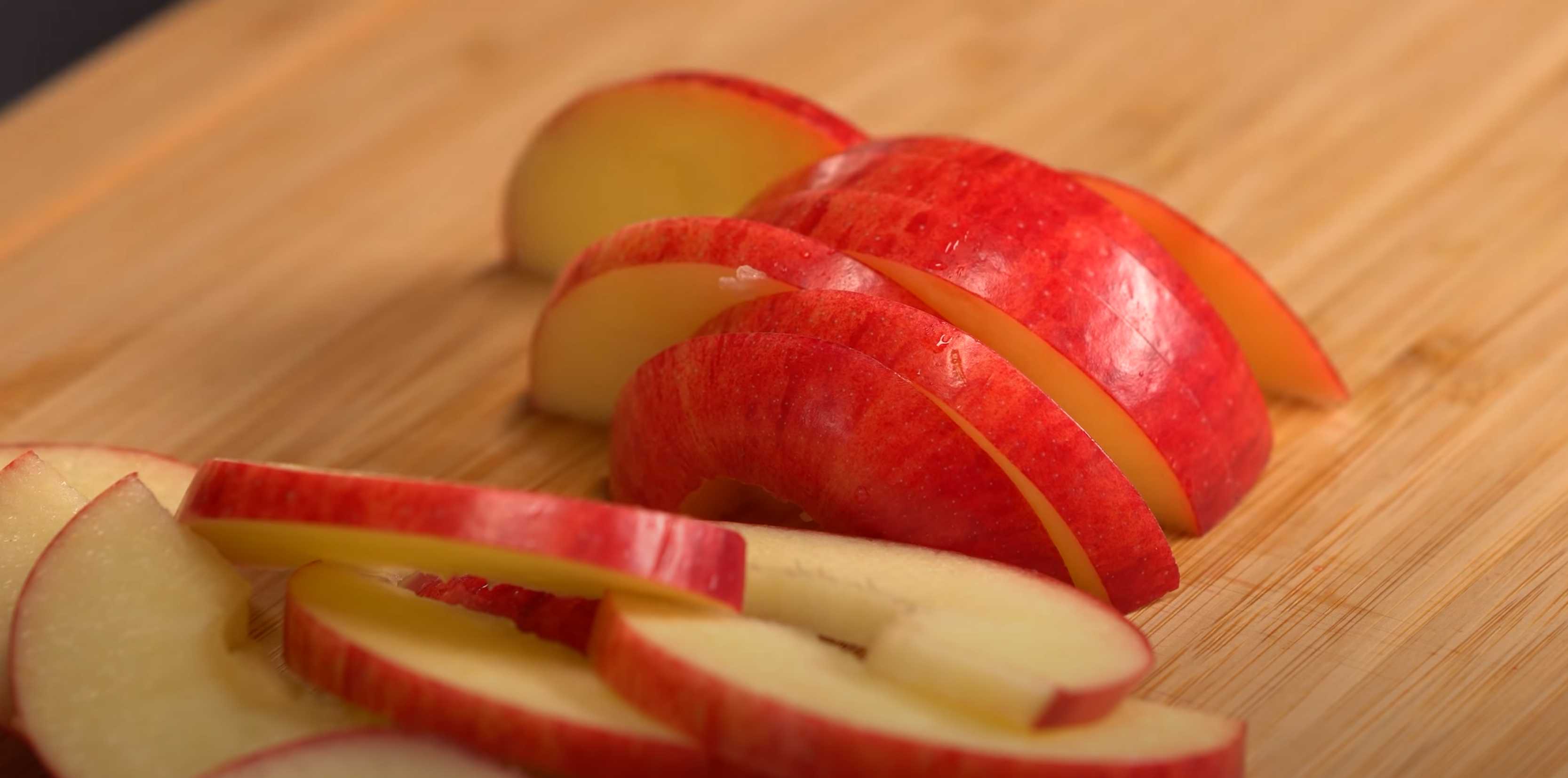 Évidez la pomme. Coupez-la en deux puis tranchez-la en demi-rondelles.