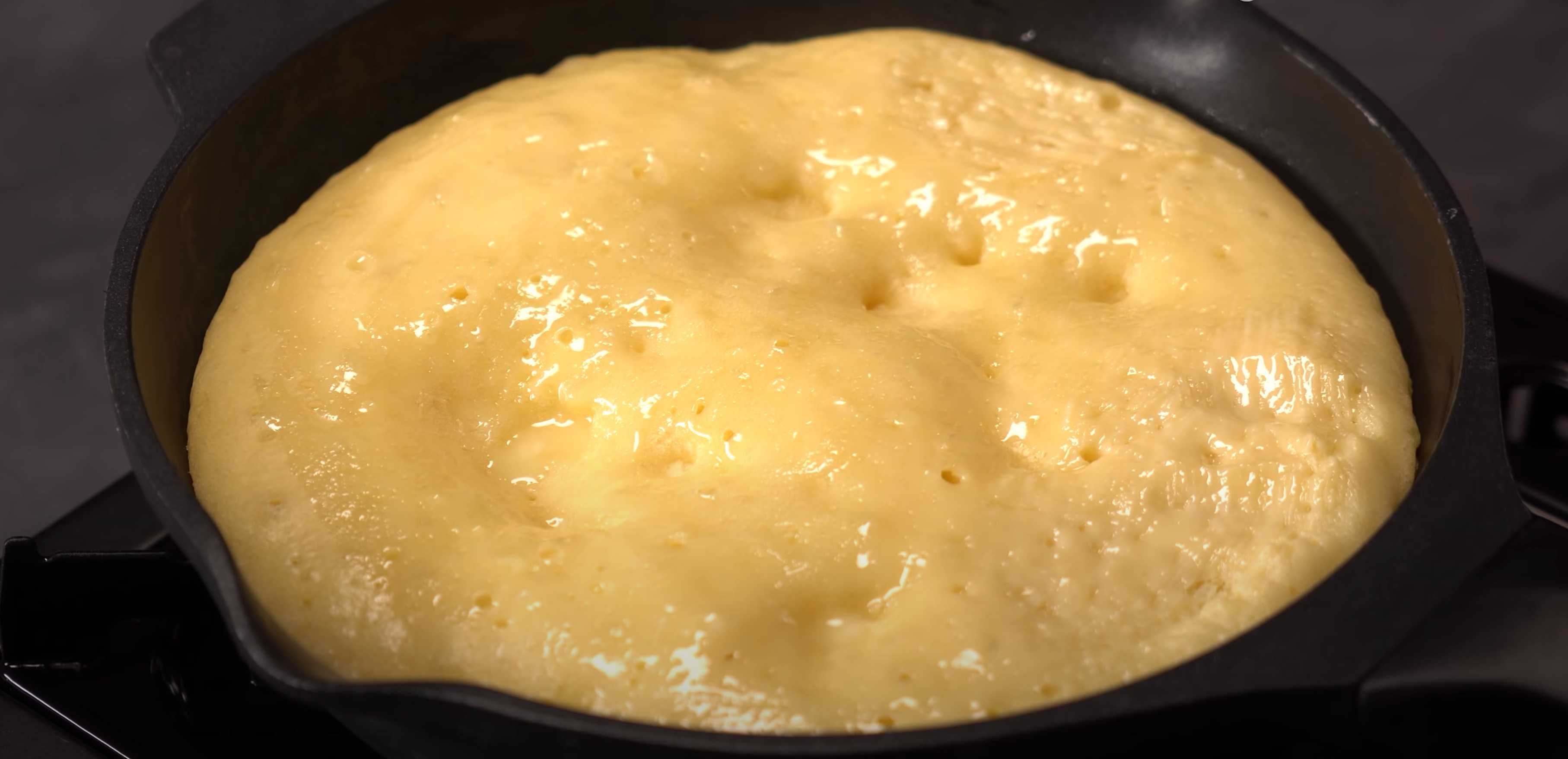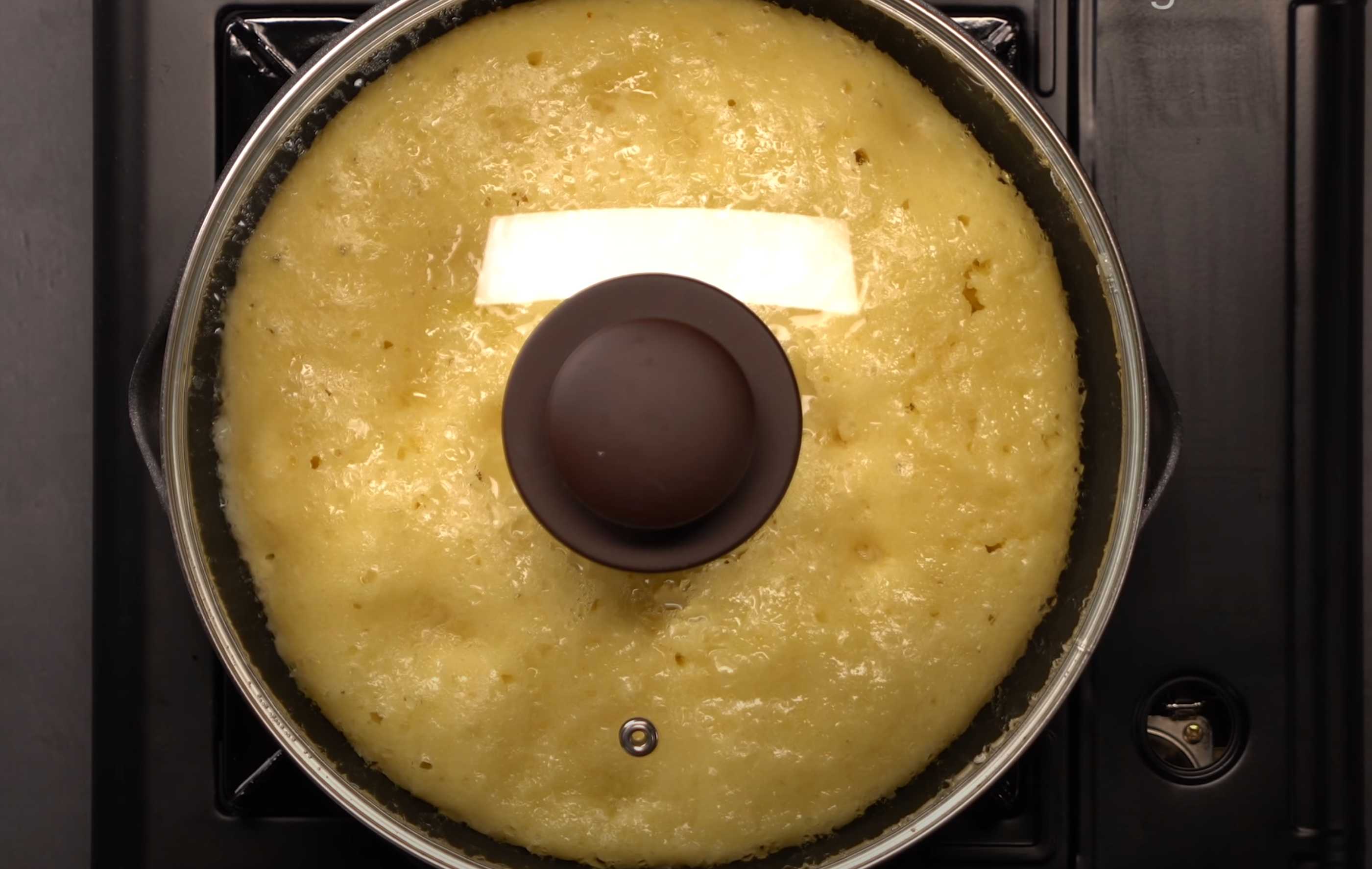 Décollez délicatement les bords du gâteau du moule à l'aide d'une spatule, couvrez le moule d'une grande assiette et retournez le gâteau sur l'assiette. Transférez-le ensuite délicatement de l'autre côté du moule. Couvrez et poursuivez la cuisson 5 minutes à feu très doux.