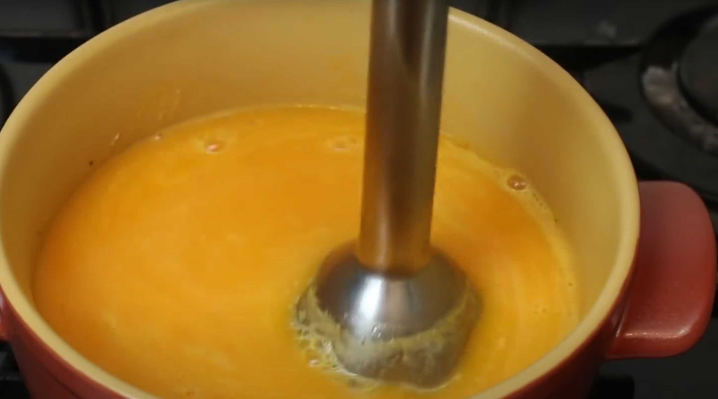Utilisez un mixeur plongeant pour réduire la soupe en purée jusqu'à obtenir une consistance lisse.