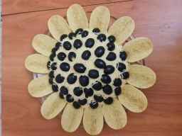 Coupez les olives en deux dans le sens de la longueur et disposez-les en cercles sur la surface de la salade, comme des graines de tournesol.
