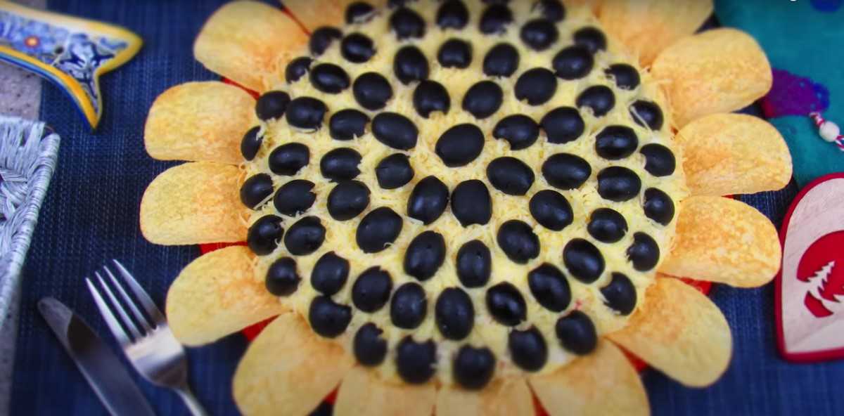 La salade de tournesol est née dans les années 1980, période où la cuisine soviétique a commencé à s'inspirer activement des recettes étrangères, tout en développant les siennes. À cette époque, les salades faciles à préparer et esthétiquement réussies ont connu un grand succès.