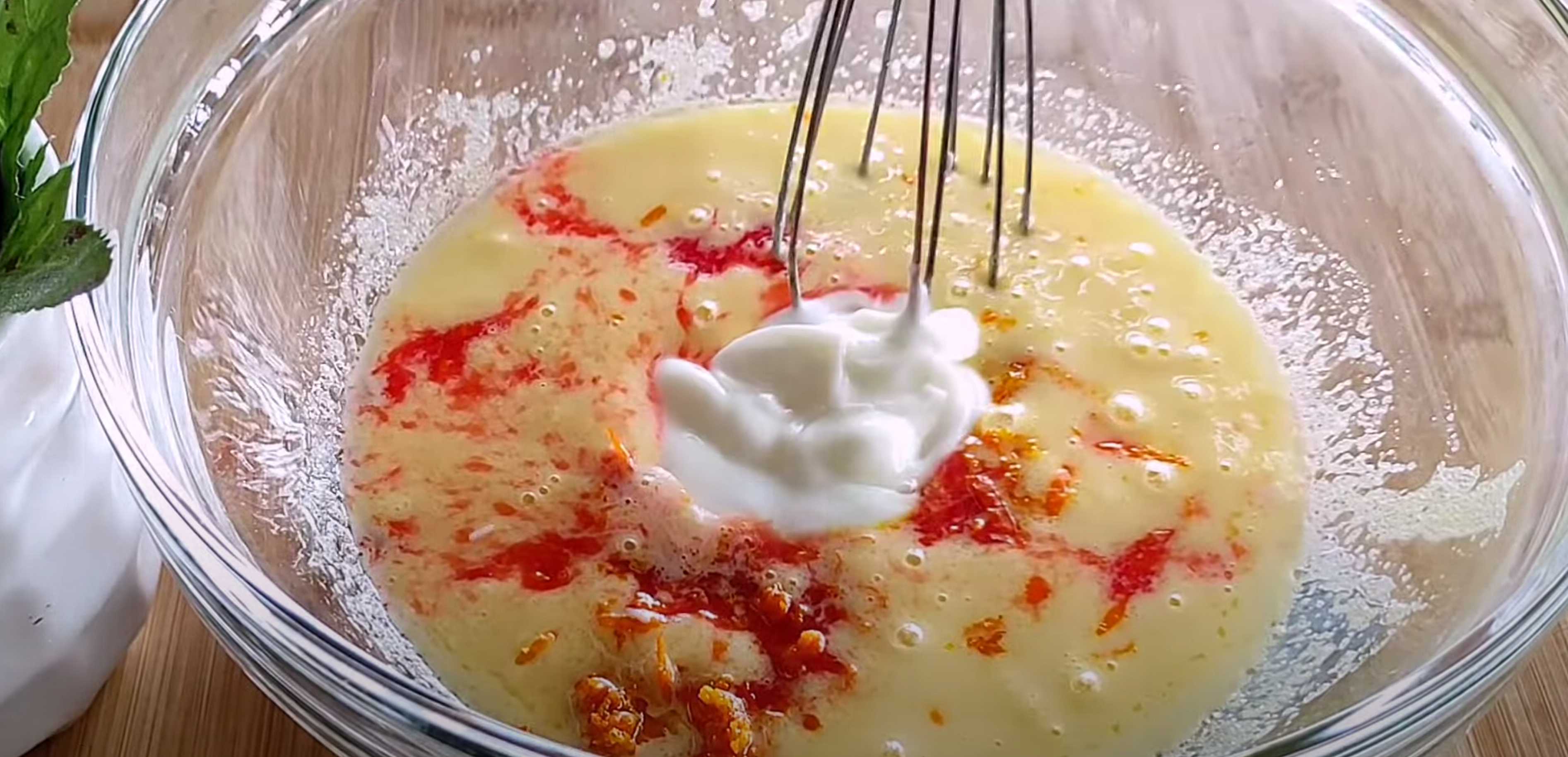 Ajouter le jus d'orange et la crème aigre, fouetter.