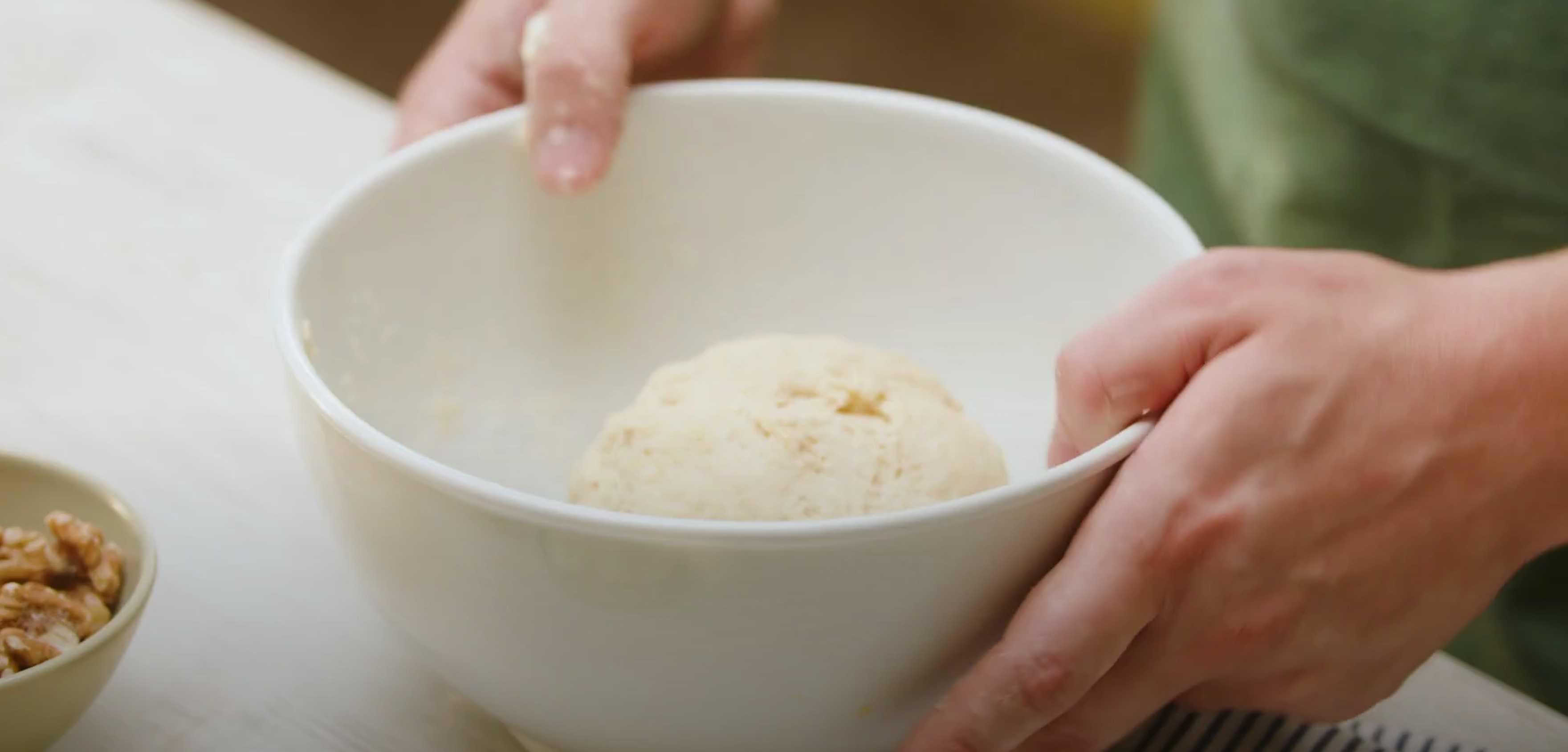 Pétrissez la pâte dans un bol sur une surface farinée, remettez-la dans le bol, couvrez-la de film plastique et laissez reposer pendant 30 à 40 minutes.