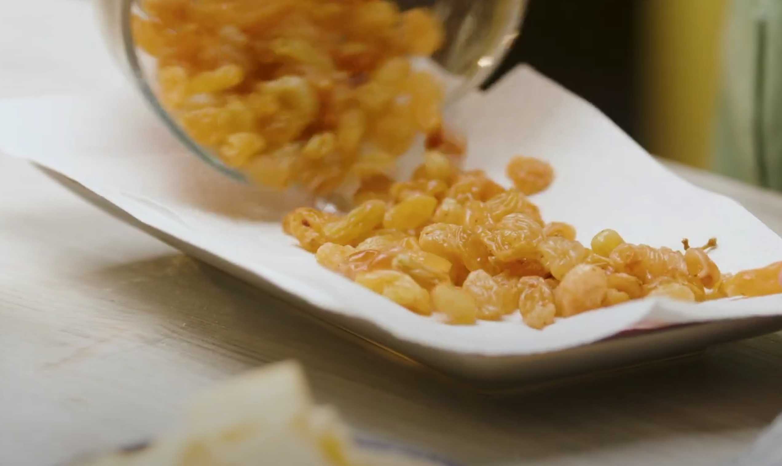 Bien rincer les raisins secs et les faire tremper dans de l'eau bouillante pendant 15 minutes, puis les égoutter et les sécher sur du papier absorbant.