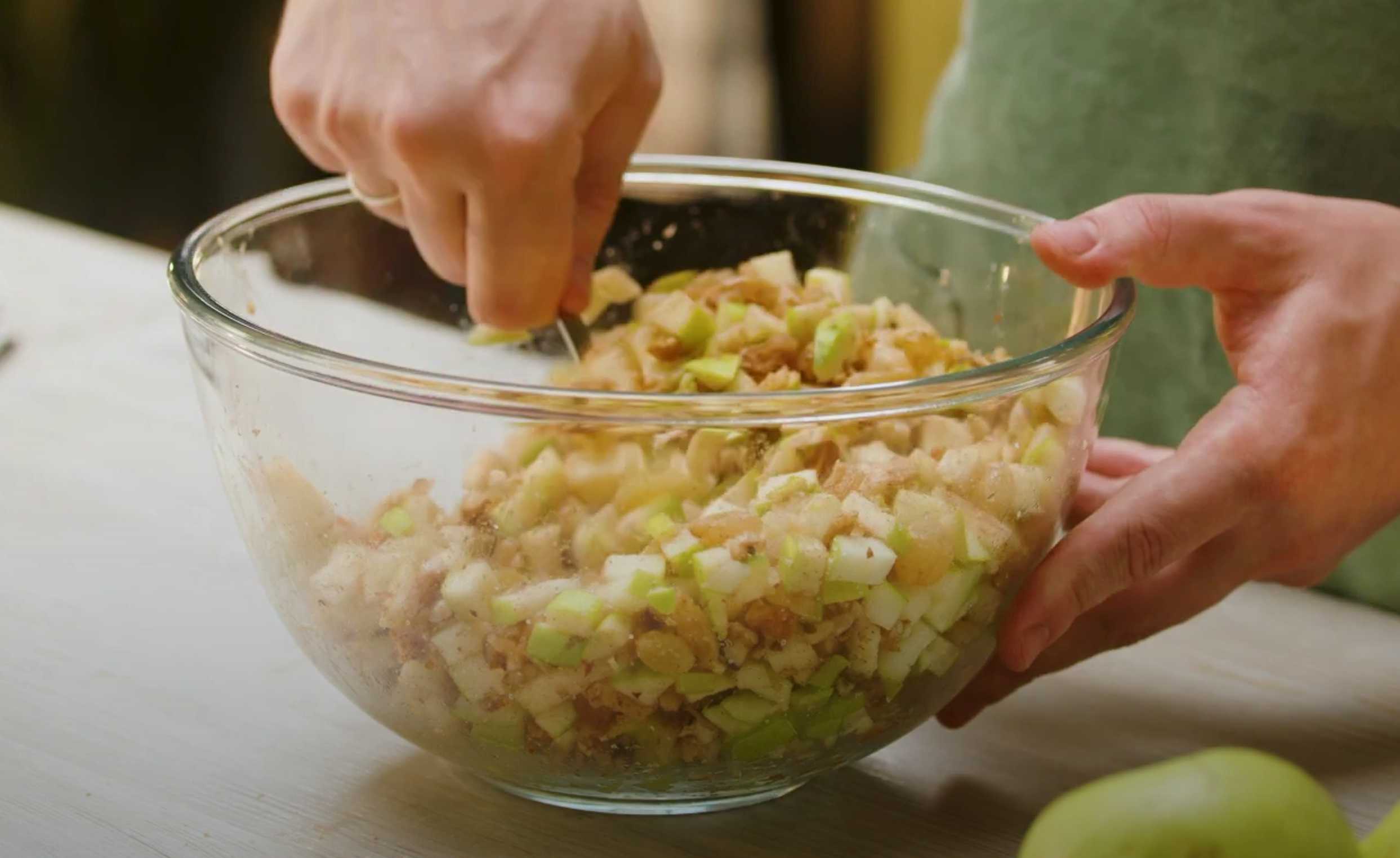 Ajoutez les raisins secs, les noix, le sucre et la cannelle aux pommes. Mélangez.