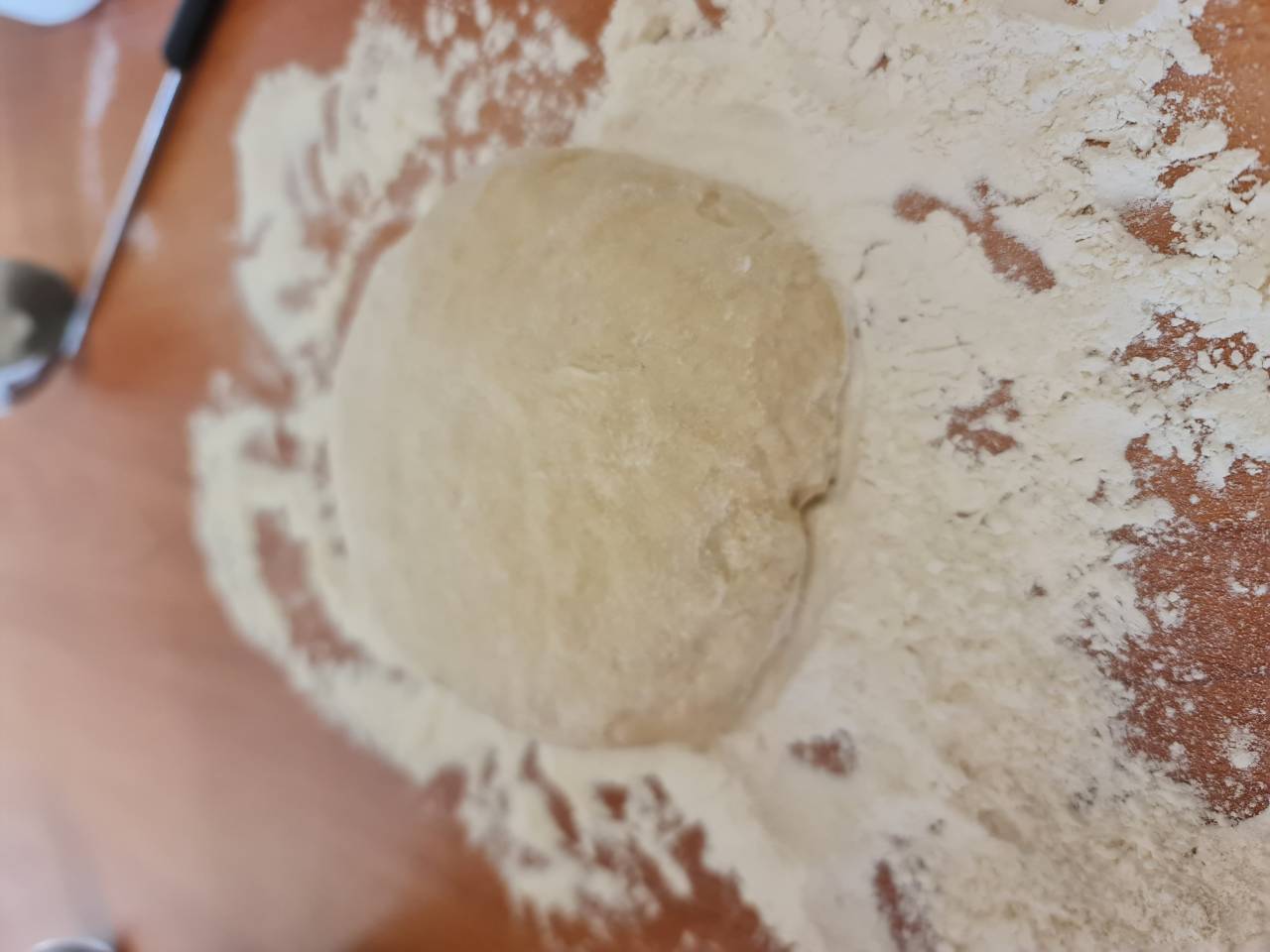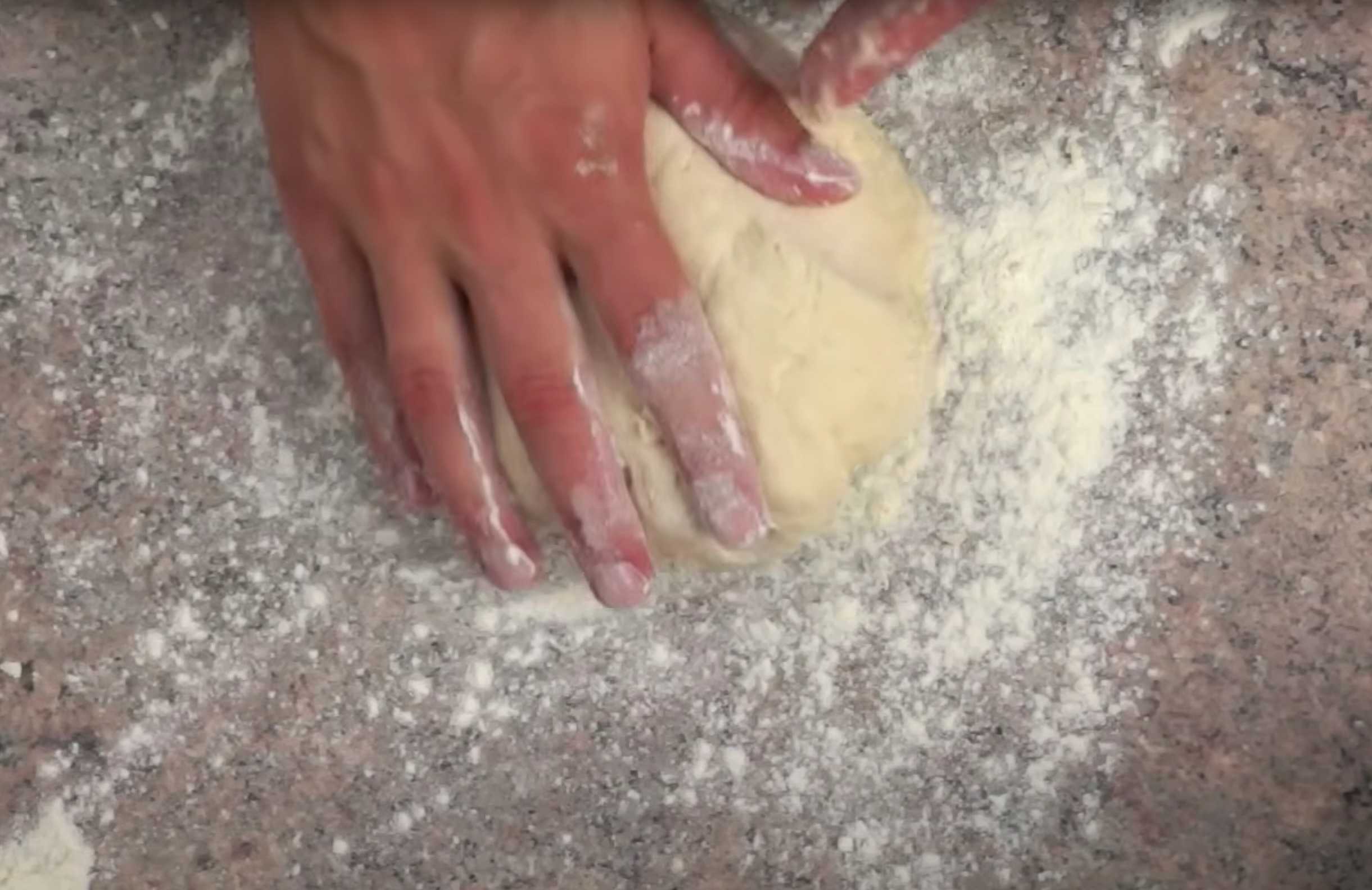 Farinez légèrement la surface, déposez-y la pâte et pétrissez-la à la main.