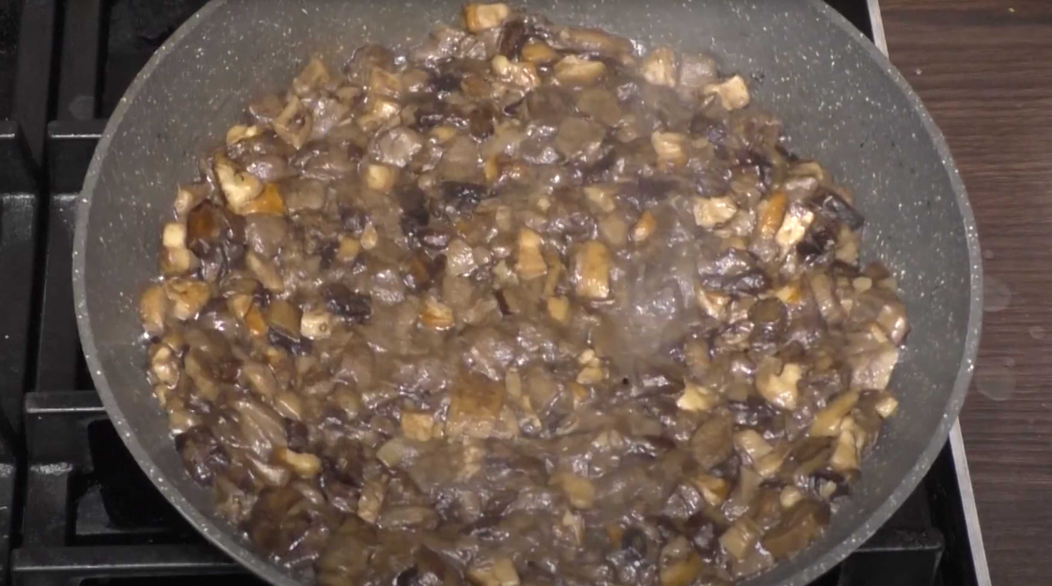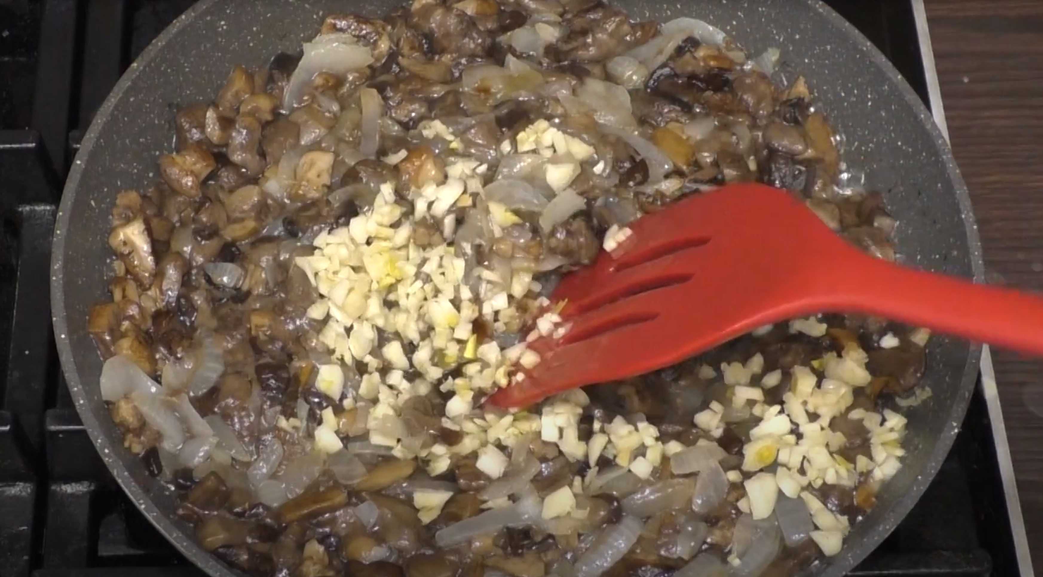 Ajoutez les oignons frits et l'ail haché aux champignons, salez, ajoutez les herbes séchées et le poivre noir, puis mélangez.