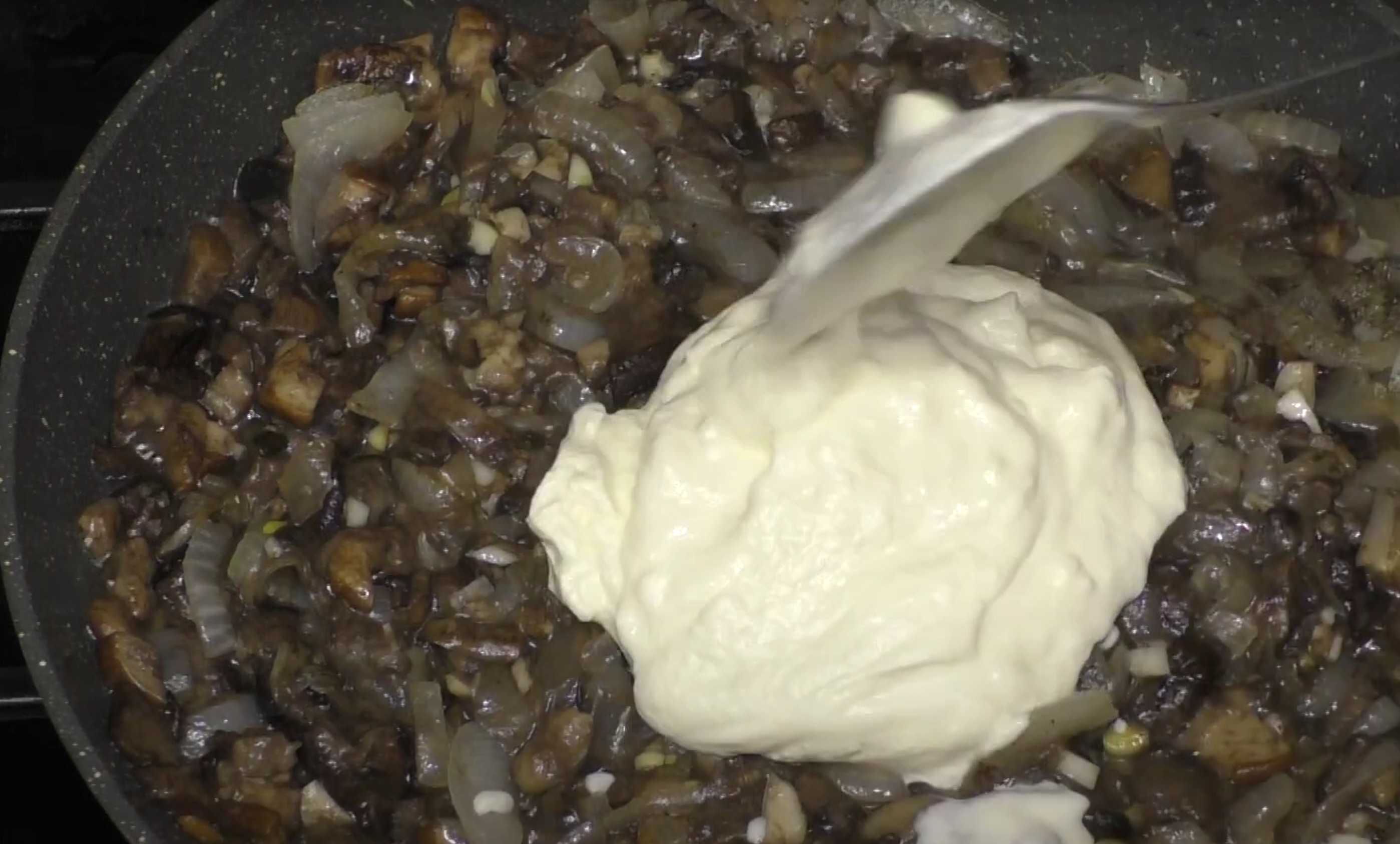 Ajouter la crème aigre, remuer et laisser mijoter quelques instants jusqu'à ce que ce soit prêt.