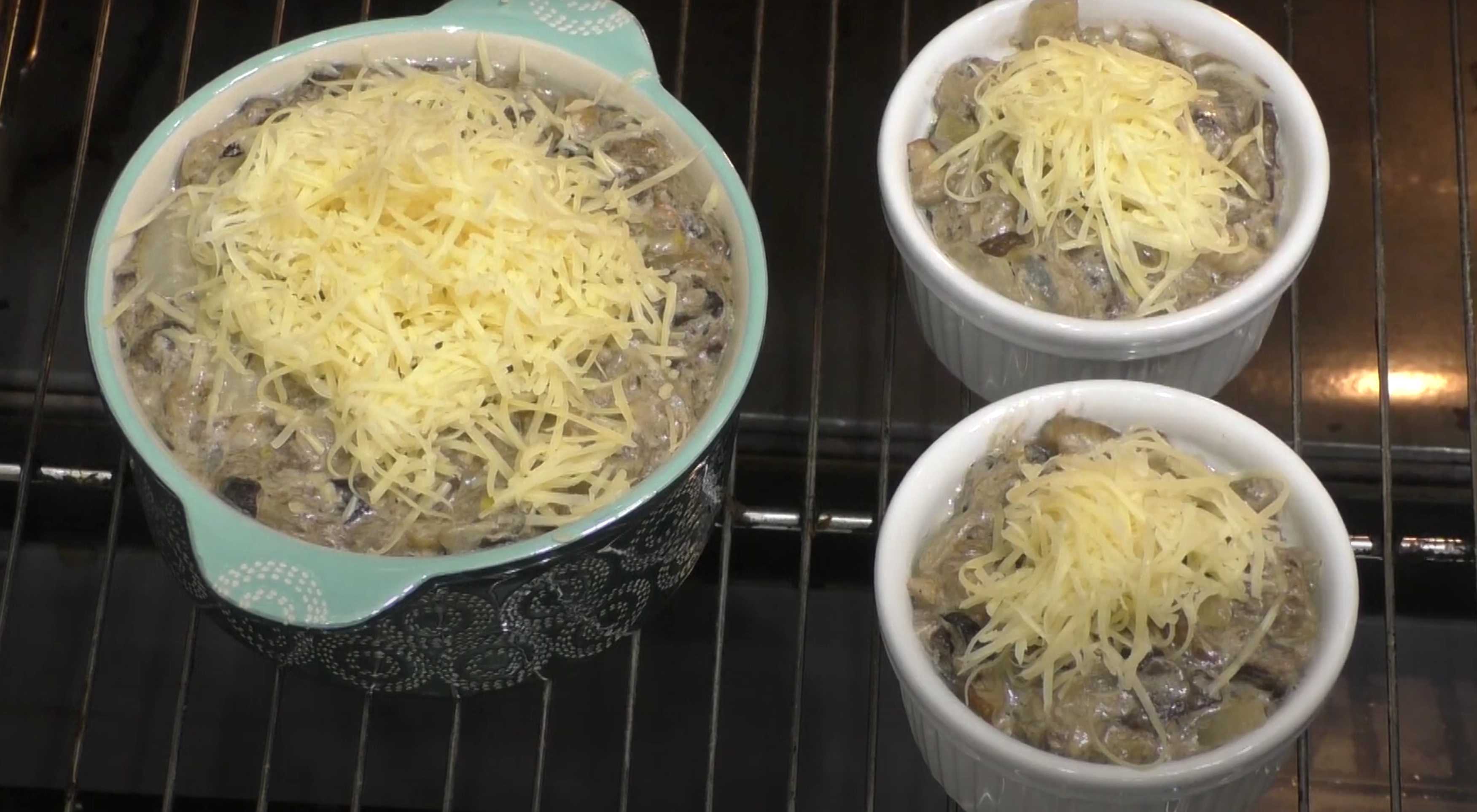 Disposez les champignons dans des cocottes et saupoudrez-les de fromage râpé.