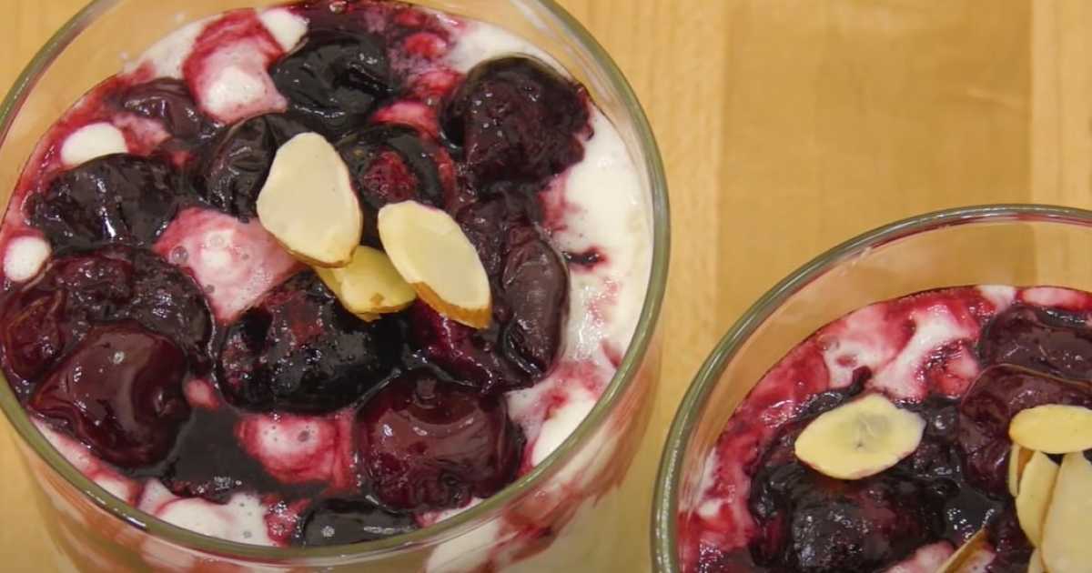 Arrosez d'un filet de sauce aux cerises et garnissez d'amandes effilées.