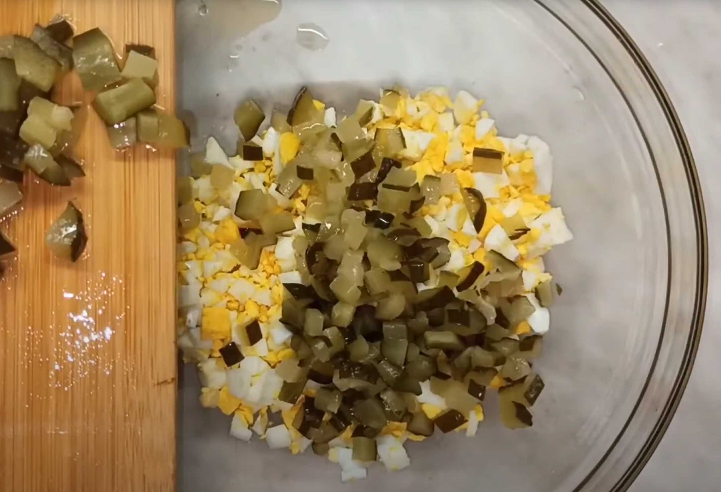Faites bouillir les œufs, laissez-les refroidir, coupez-les en petits cubes et placez-les dans un bol.