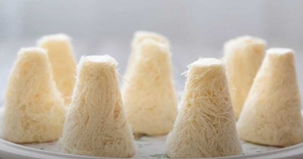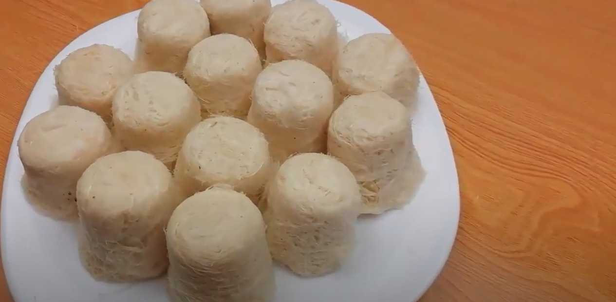 La barbe à papa maison « Talkysh Kaleve » se prépare différemment de son homologue européenne, ressemblant davantage à de longues nouilles. Son secret réside dans l'enrobage des filaments de caramel chaud avec un mélange chaud et toasté de farine et de beurre fondu lors de l'étirage, ce qui les empêche de coller. La préparation de cette gourmandise est un véritable défi, un art délicat qui relève presque de la magie, mais le résultat est une barbe à papa légère et savoureuse. Préparez du Talkysh Kaleve chez vous et savourez ce dessert traditionnel tatar qui ravira vos proches par sa saveur subtile et sa texture croustillante !