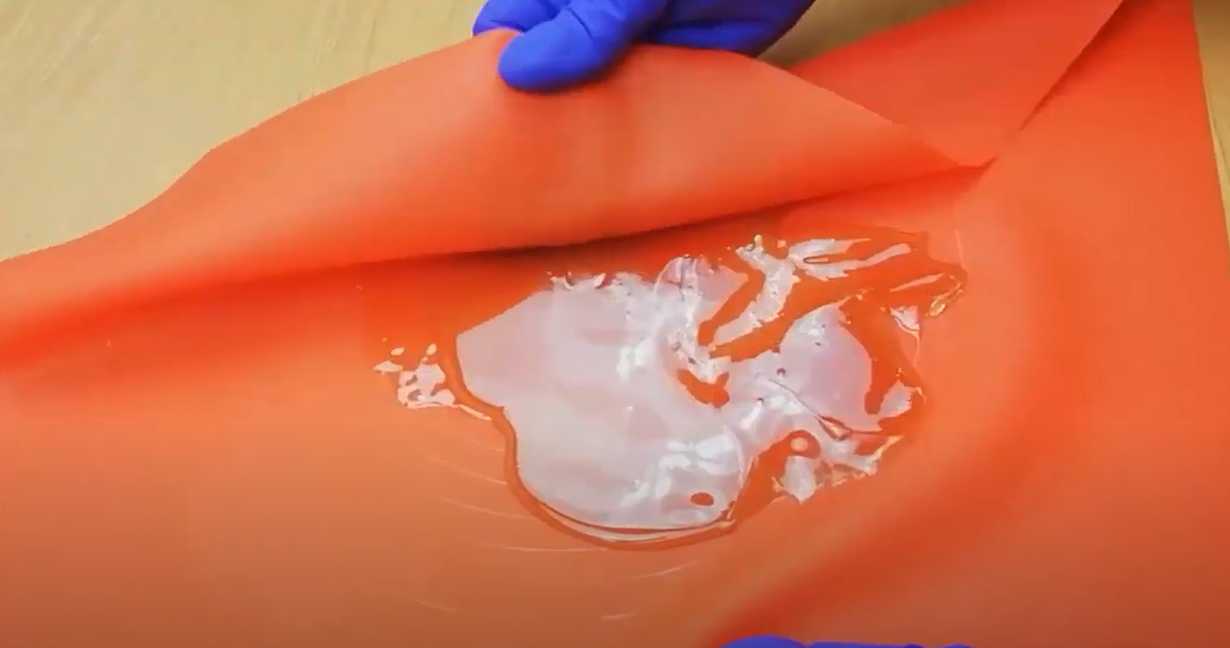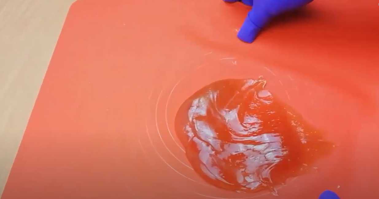En utilisant des gants en caoutchouc, remuez constamment le caramel au centre du tapis, en l'empêchant de durcir et de former une galette plate.