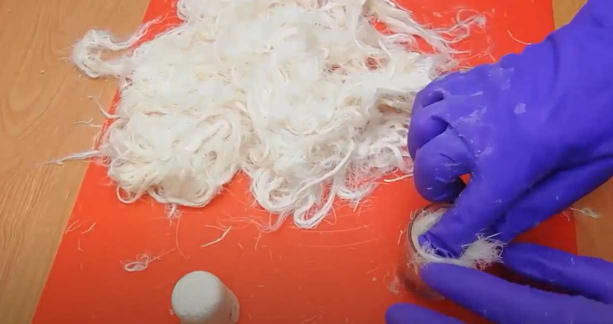 Effilochez les fibres, remplissez un verre à moitié avec elles, tassez-les en formant une dépression, mettez-y les noix concassées, ajoutez une autre couche de « ouate » et tassez-la.