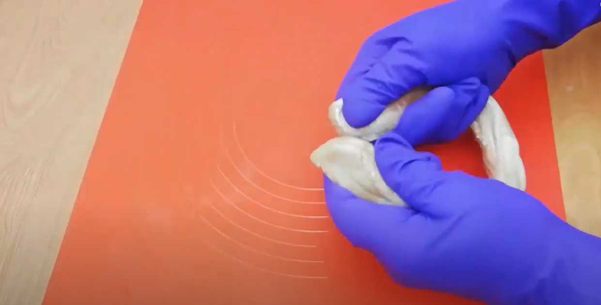 Lorsque la masse s'épaissit, prenez-la dans vos mains et étirez-la rapidement, pliez-la en deux et étirez-la à nouveau jusqu'à ce qu'elle devienne blanche et brillante.
