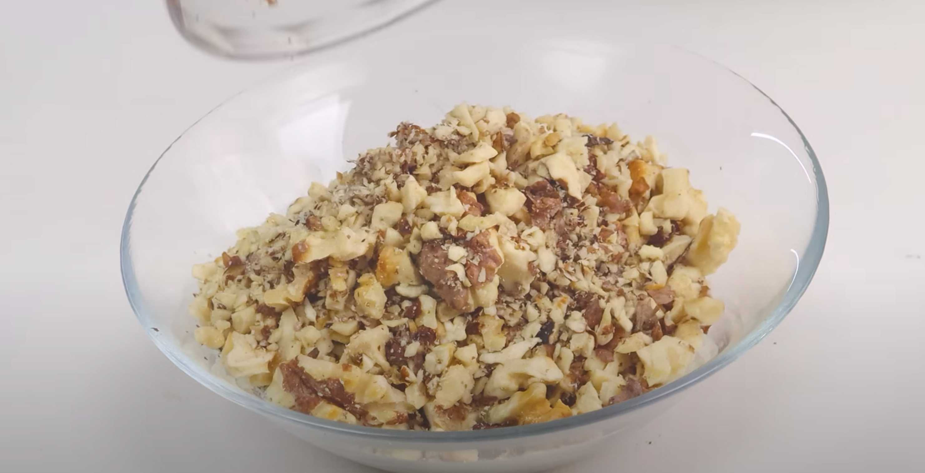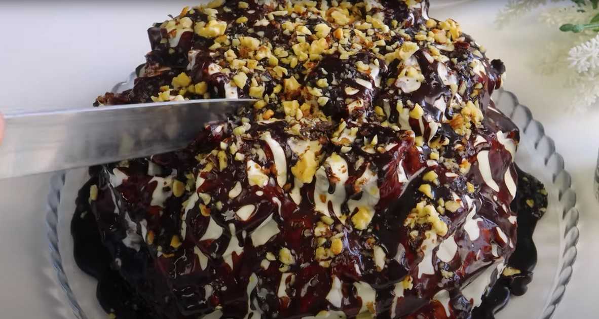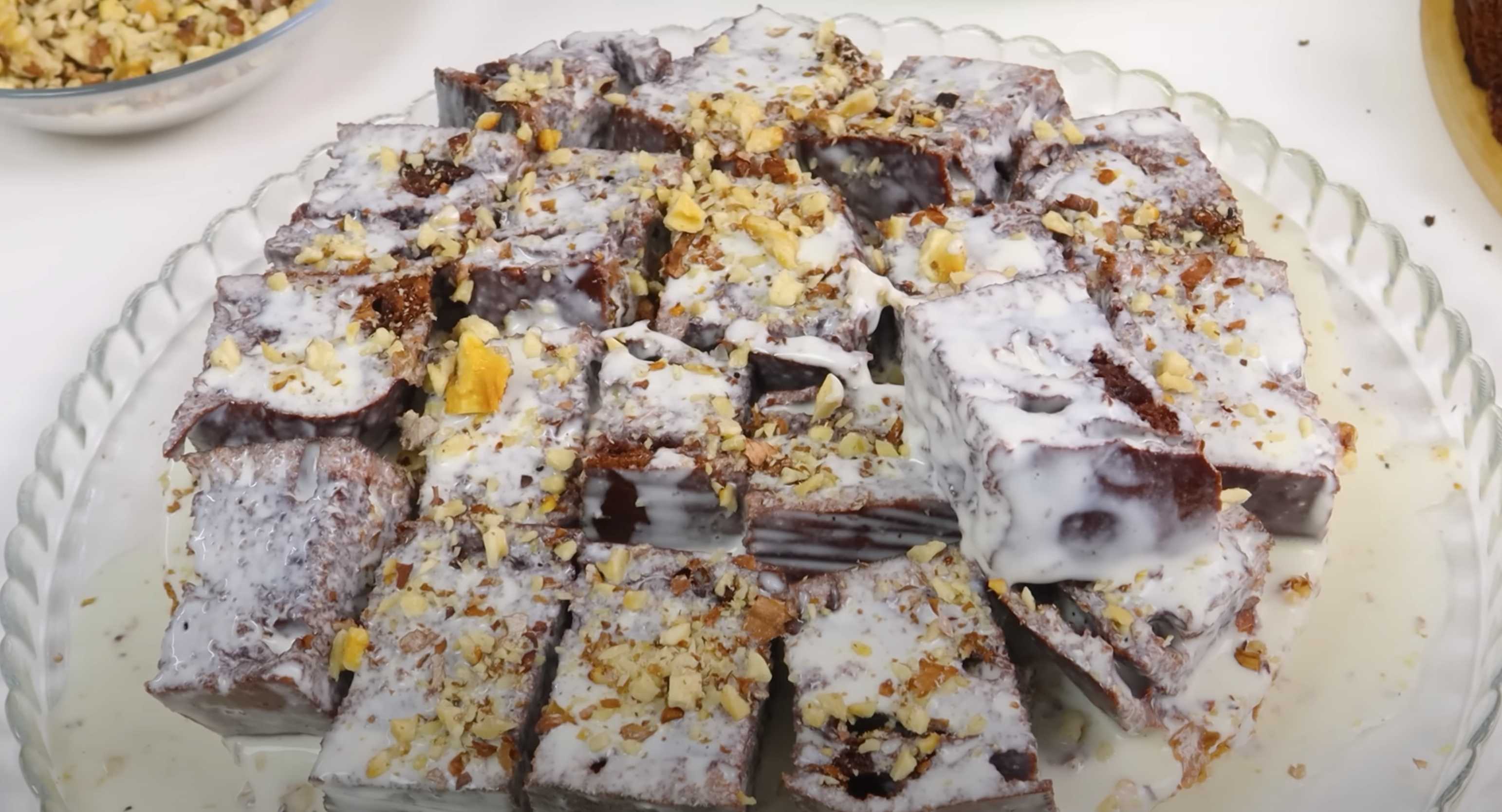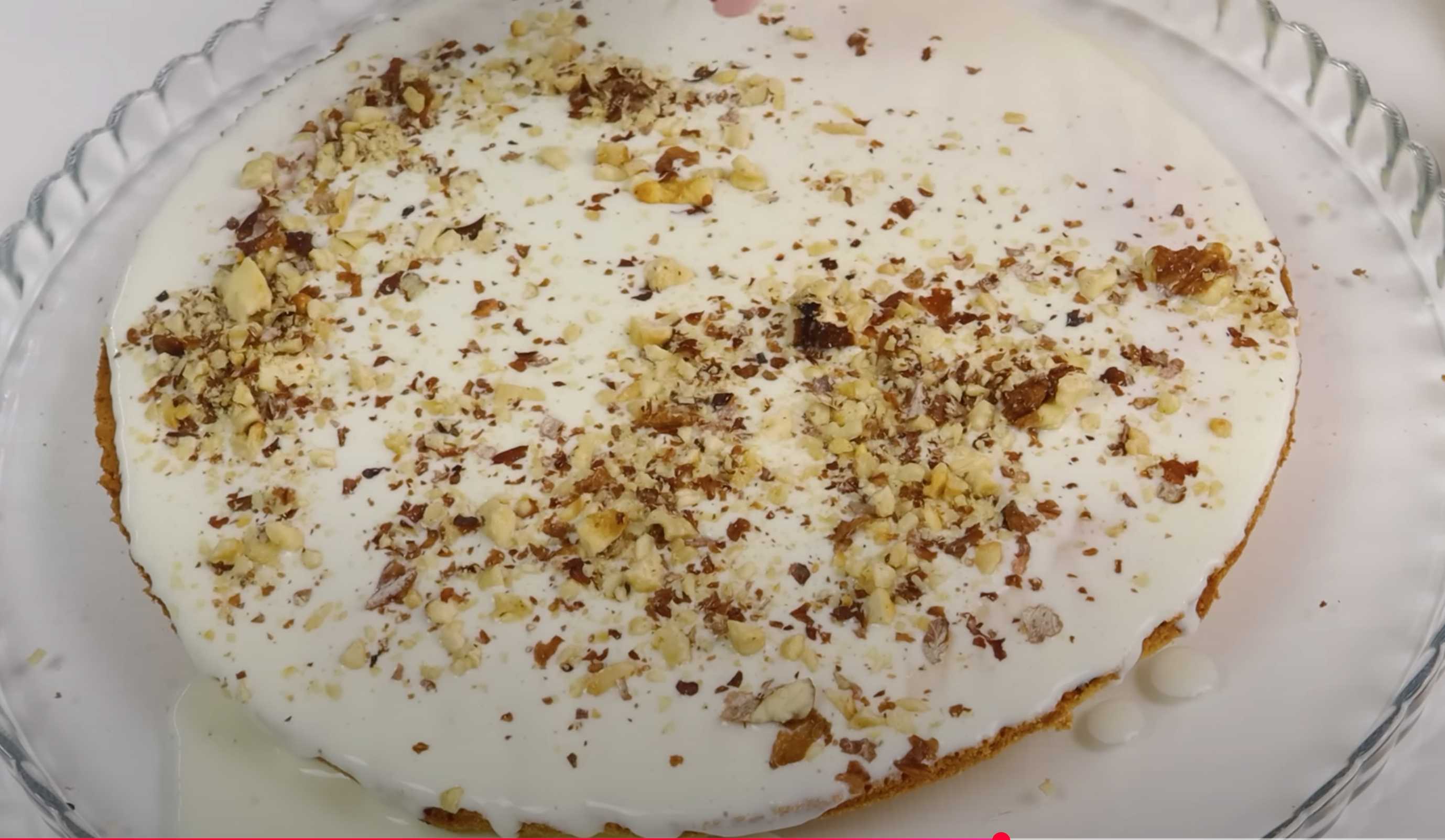 Parsemez le gâteau de noix et mettez-le au réfrigérateur pendant plusieurs heures pour qu'il s'imbibe.