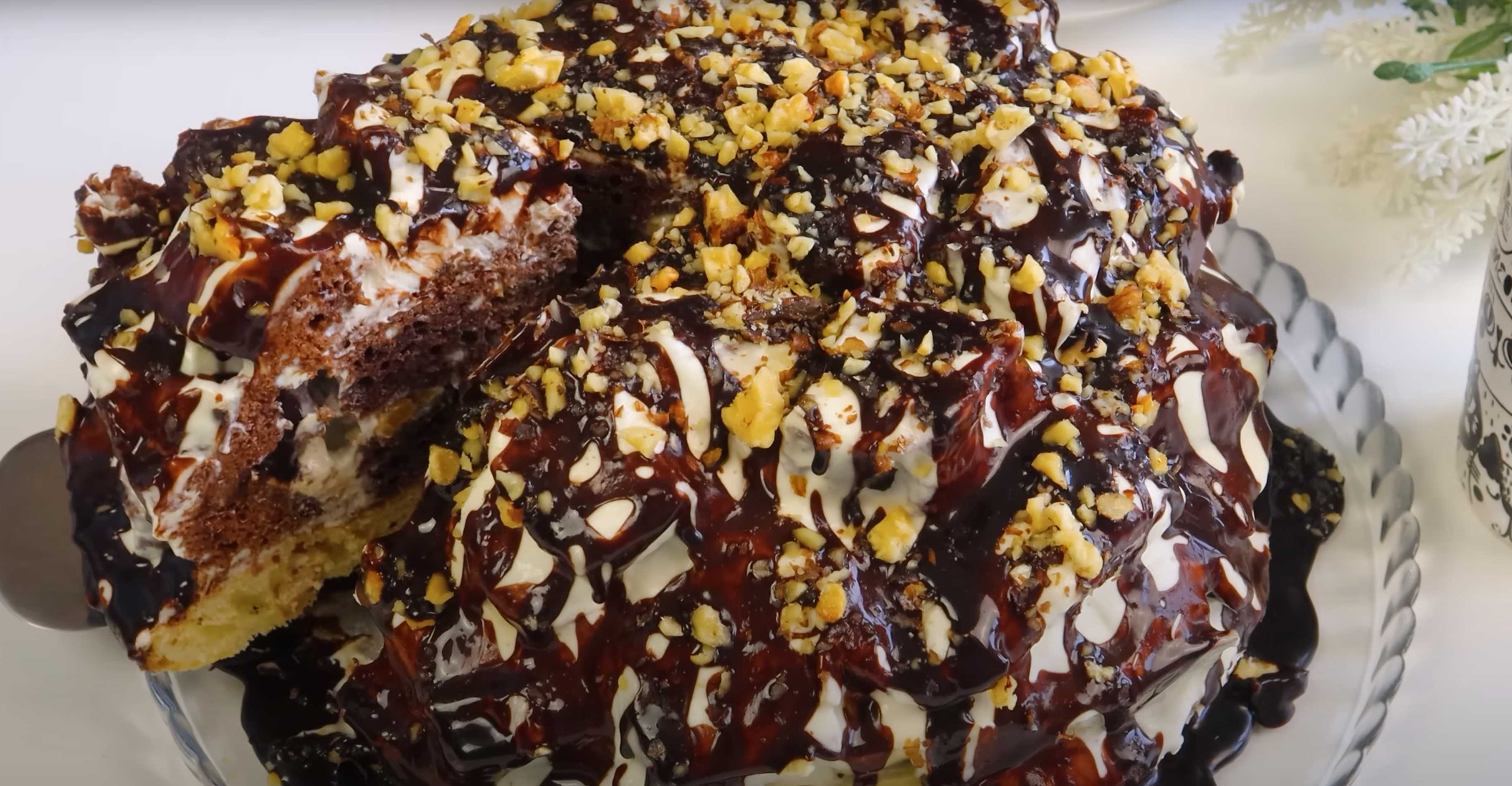 Trempez les morceaux de gâteau au chocolat dans la crème, disposez-les en une couche sur le gâteau blanc, parsemez de noix et continuez à les disposer en dôme de la même manière.