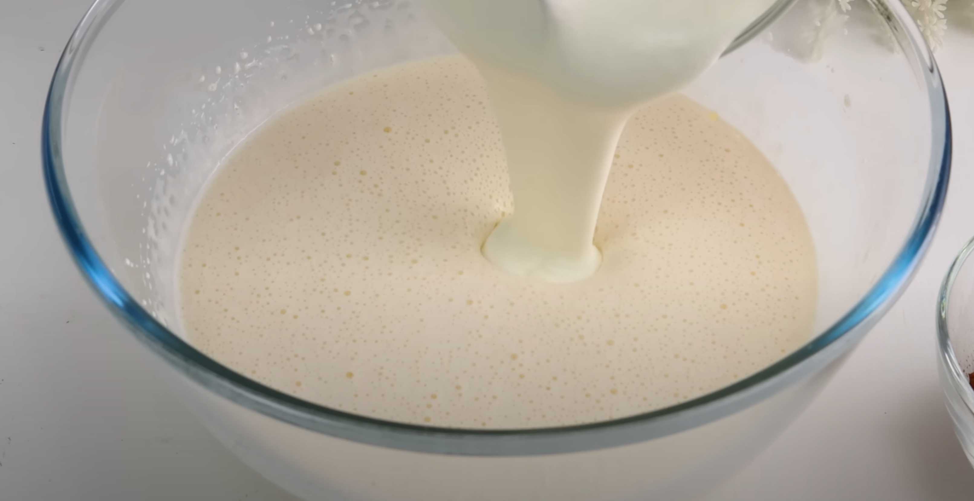 Ajouter le bicarbonate de soude à la crème aigre, mélanger et verser dans la préparation.