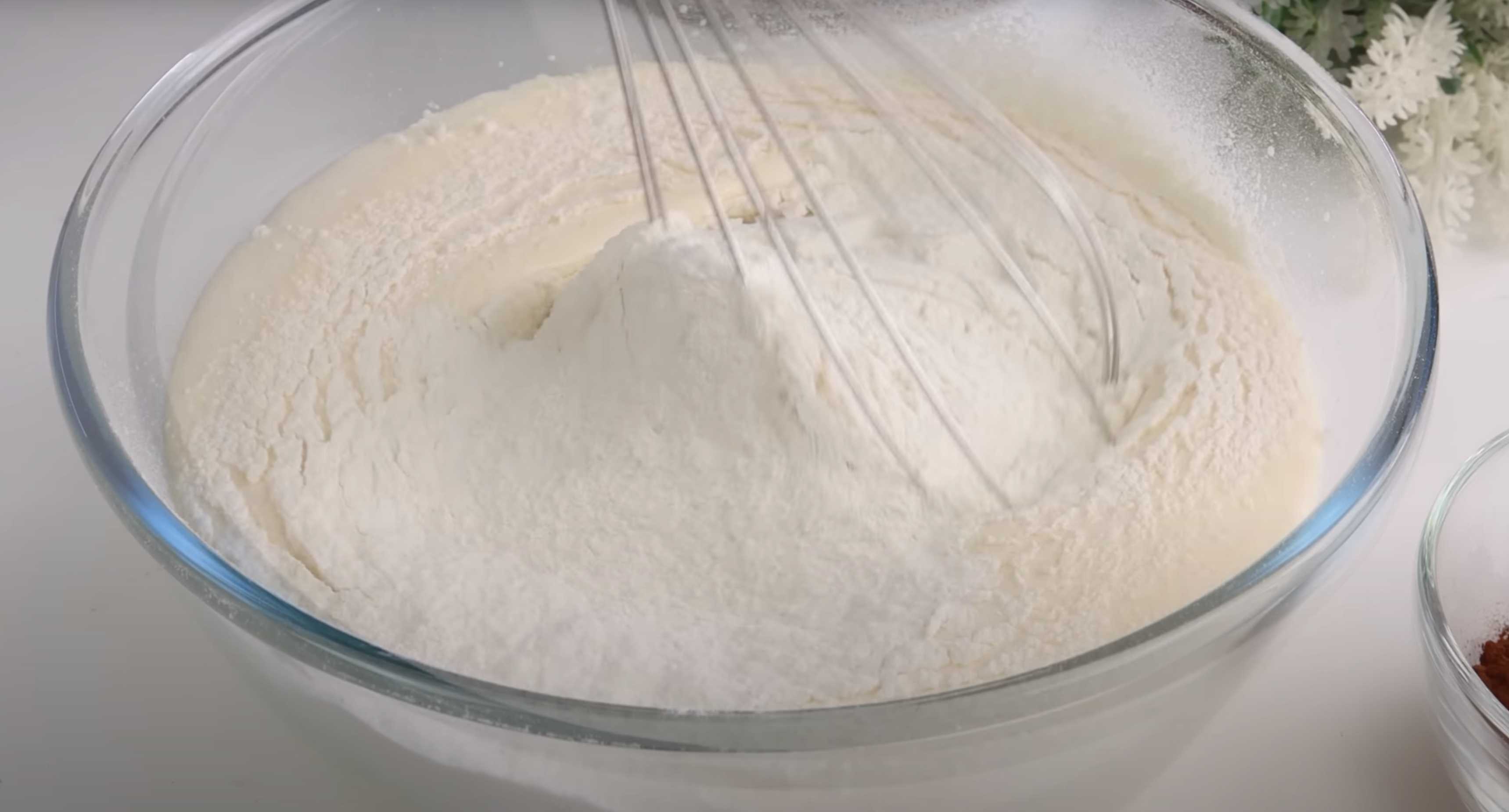 Tamisez la farine, ajoutez la levure chimique et mélangez au fouet.