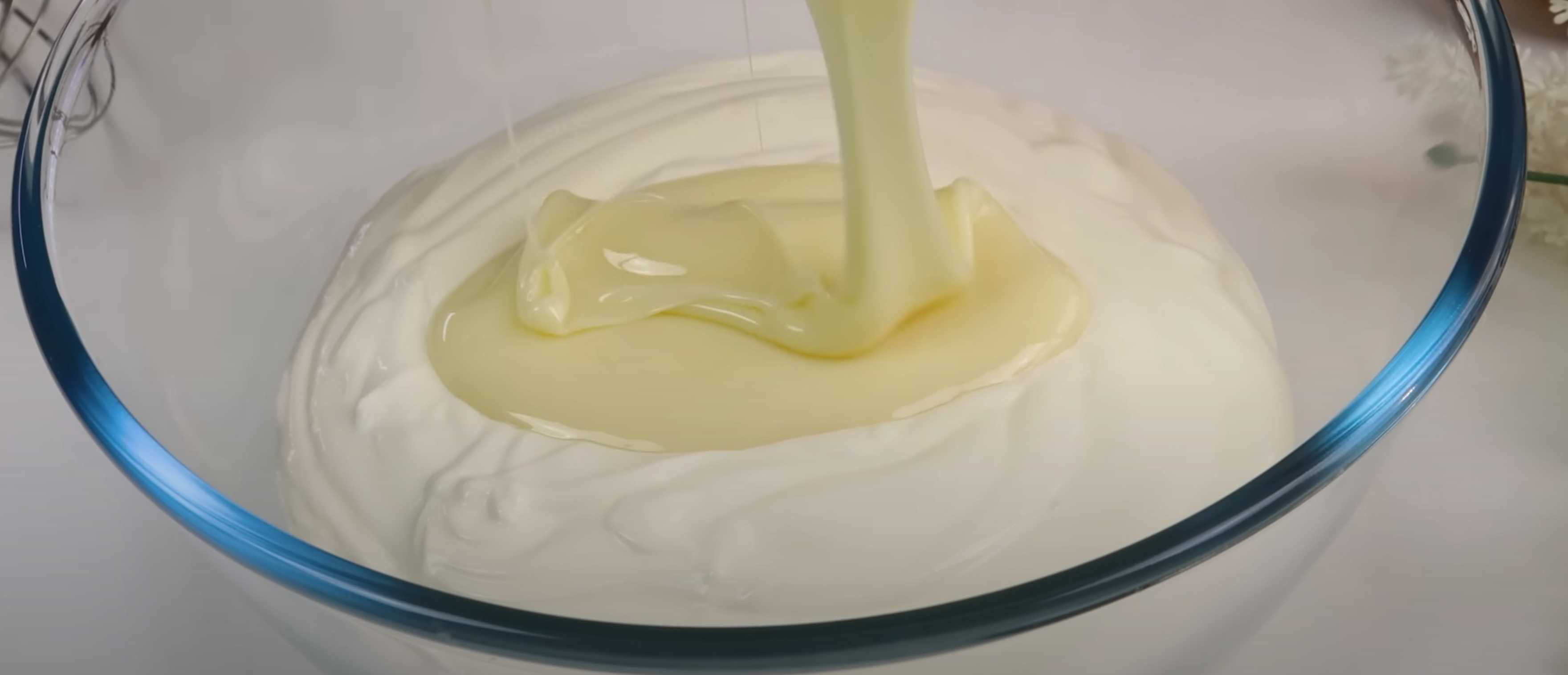 Versez la crème aigre dans un bol, ajoutez le lait concentré et mélangez au fouet.