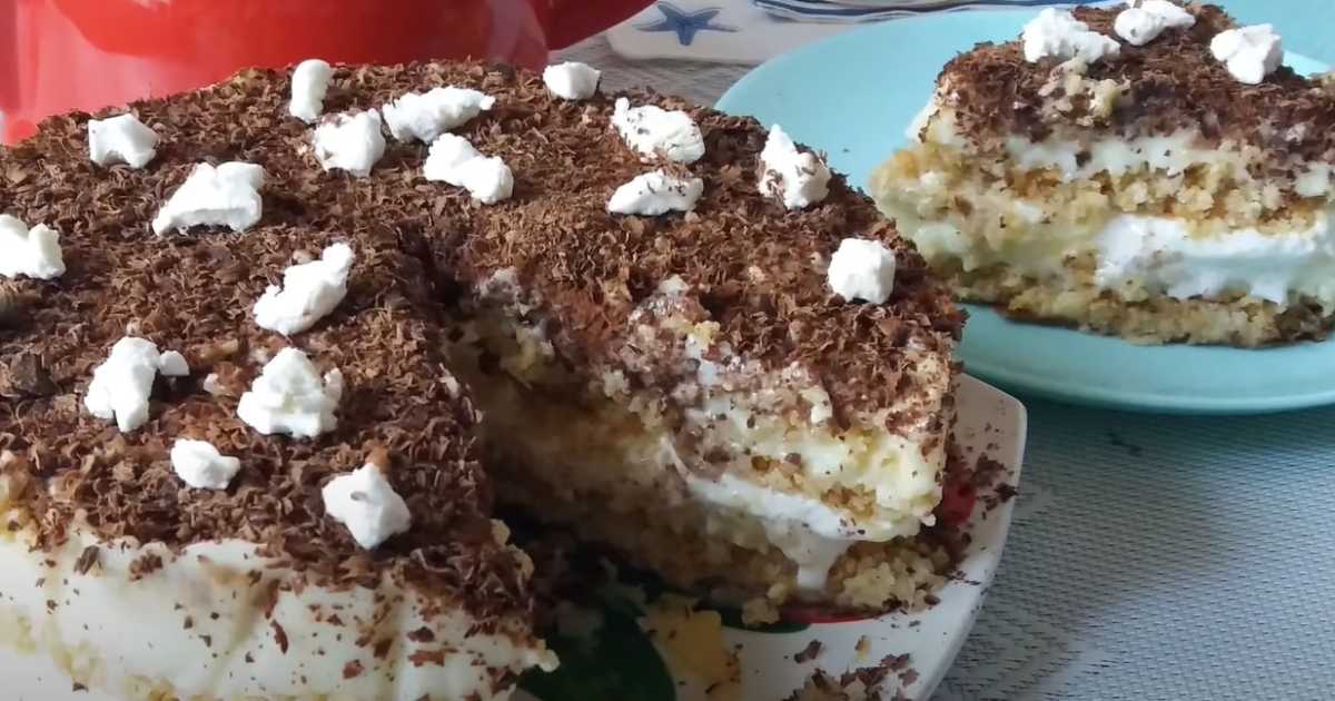 Pour la couche supérieure, mélangez les miettes restantes avec la crème. Réfrigérez le gâteau pour qu'il s'imbibe.