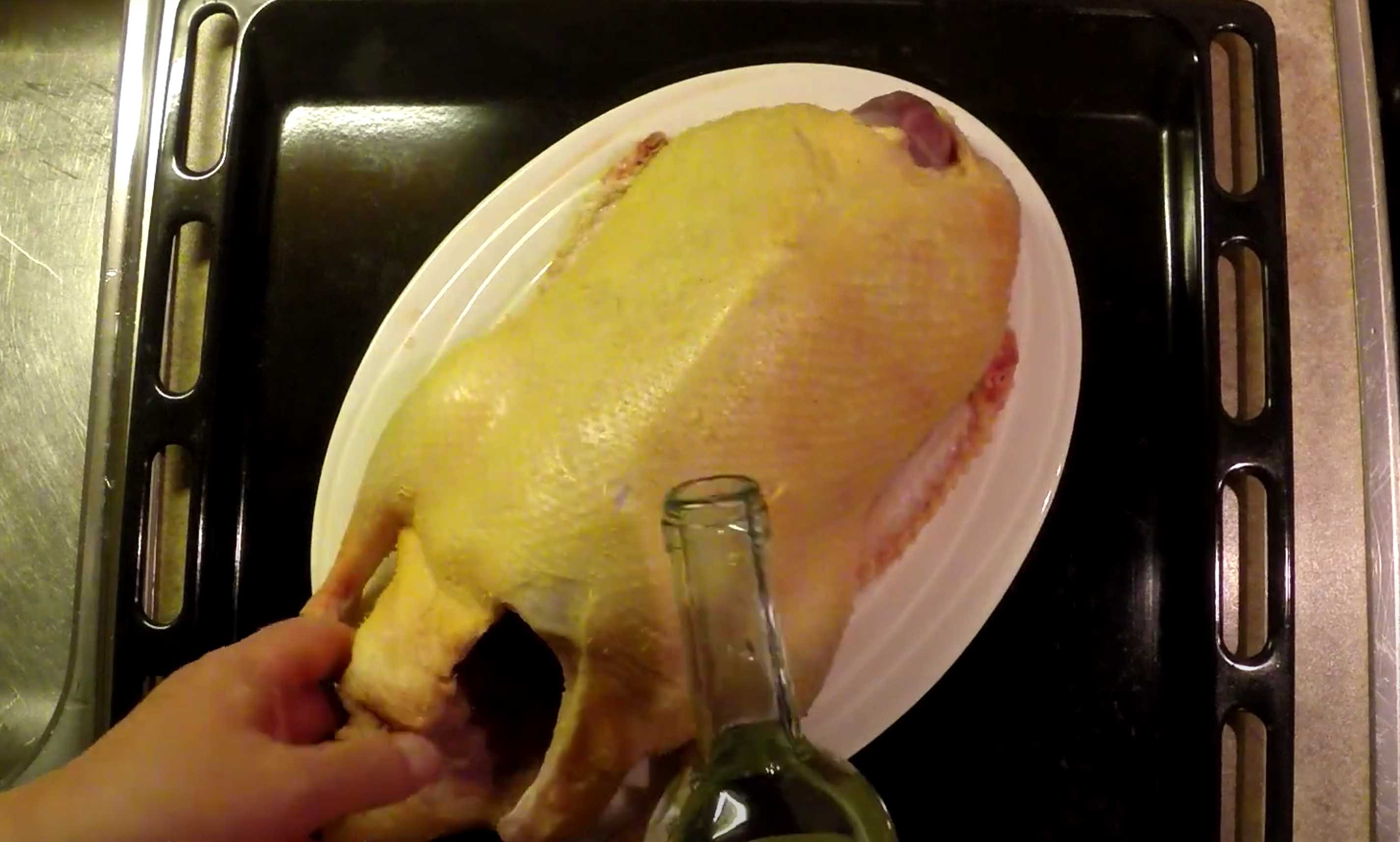 Versez de l'eau bouillante sur le canard, puis arrosez-le de vin blanc sec et frottez-le sur la peau. Versez un peu de vin à l'intérieur du canard. Saupoudrez le canard de gros sel et frottez-le à l'intérieur et à l'extérieur. Enfilez le canard sur une bouteille et mettez-le au réfrigérateur pendant 12 heures.