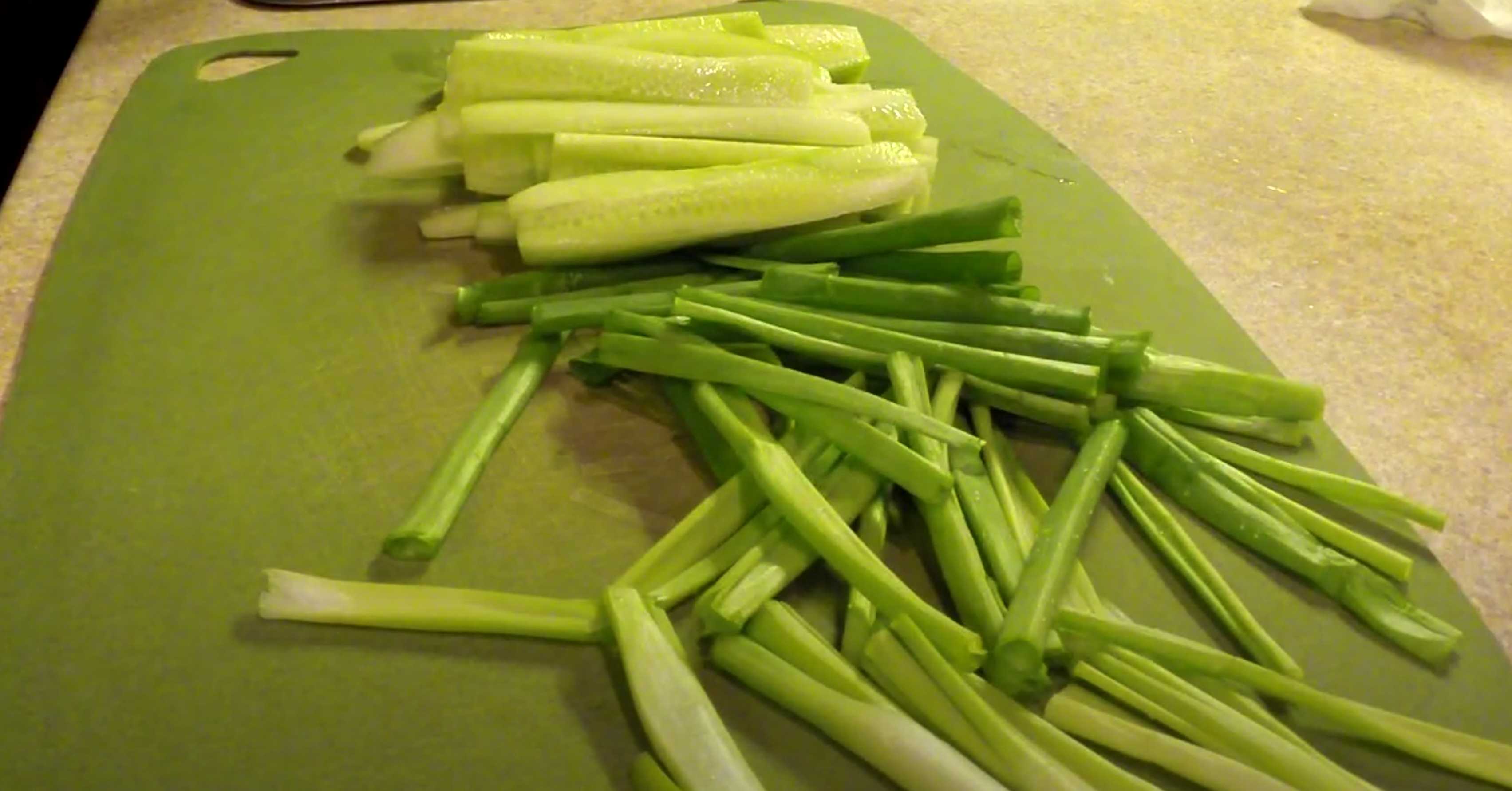 Pelez et tranchez les concombres. Coupez les oignons verts en morceaux.