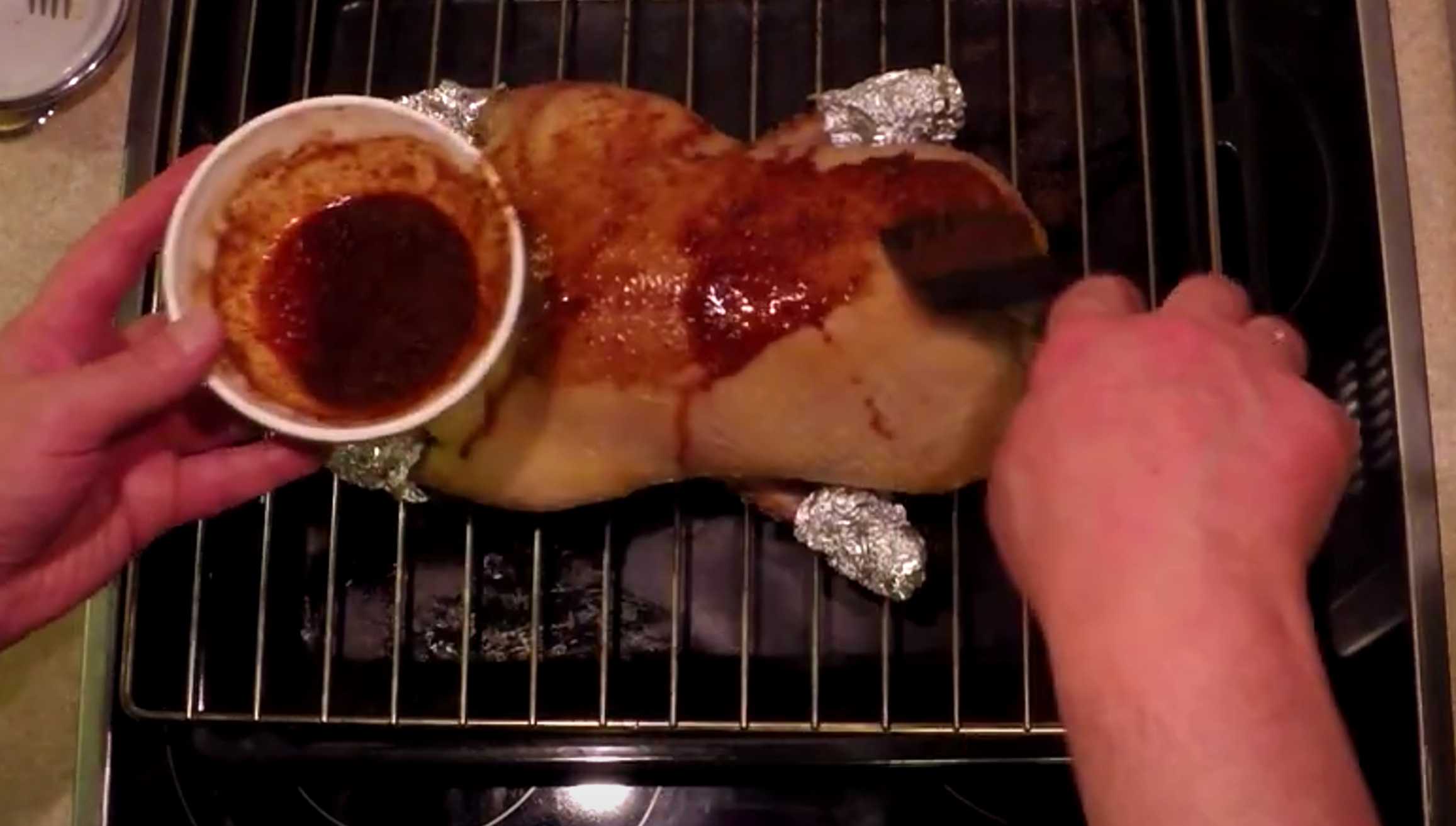 Sortez le canard du four, retirez le papier aluminium en ne l'enveloppant que autour des cuisses et du bout des ailes, et badigeonnez le canard avec la première sauce.