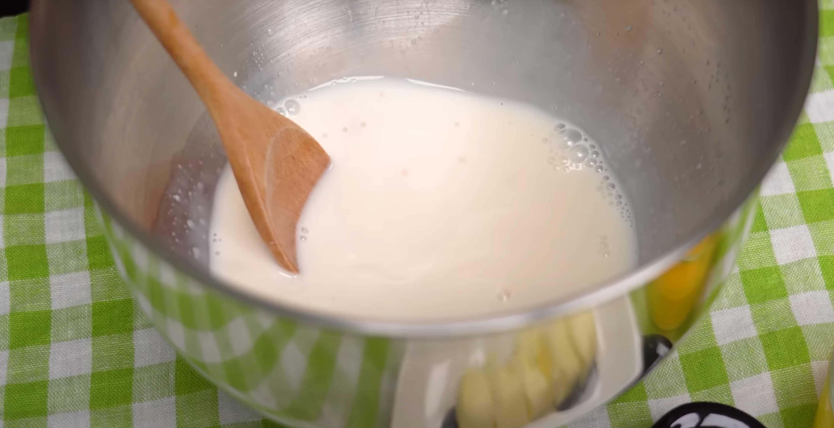 Versez le lait tiède dans un bol, ajoutez le sucre et émiettez la levure fraîche. Mélangez.