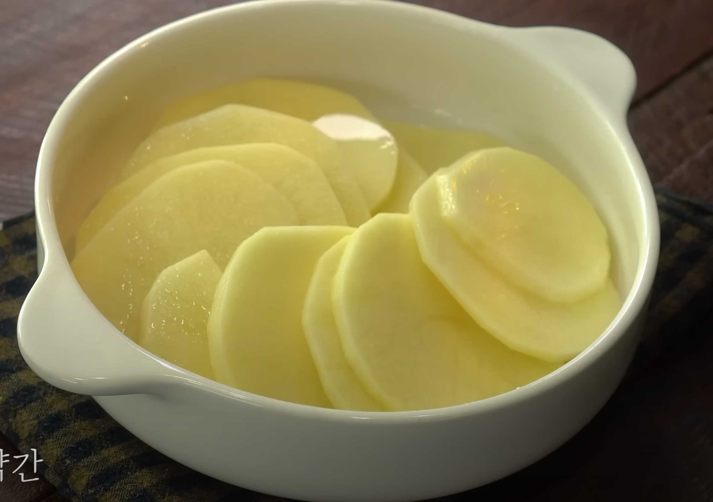 Épluchez les pommes de terre, coupez-les en tranches, recouvrez-les d'eau et faites-les cuire au micro-ondes pendant 7 minutes à 700 W.