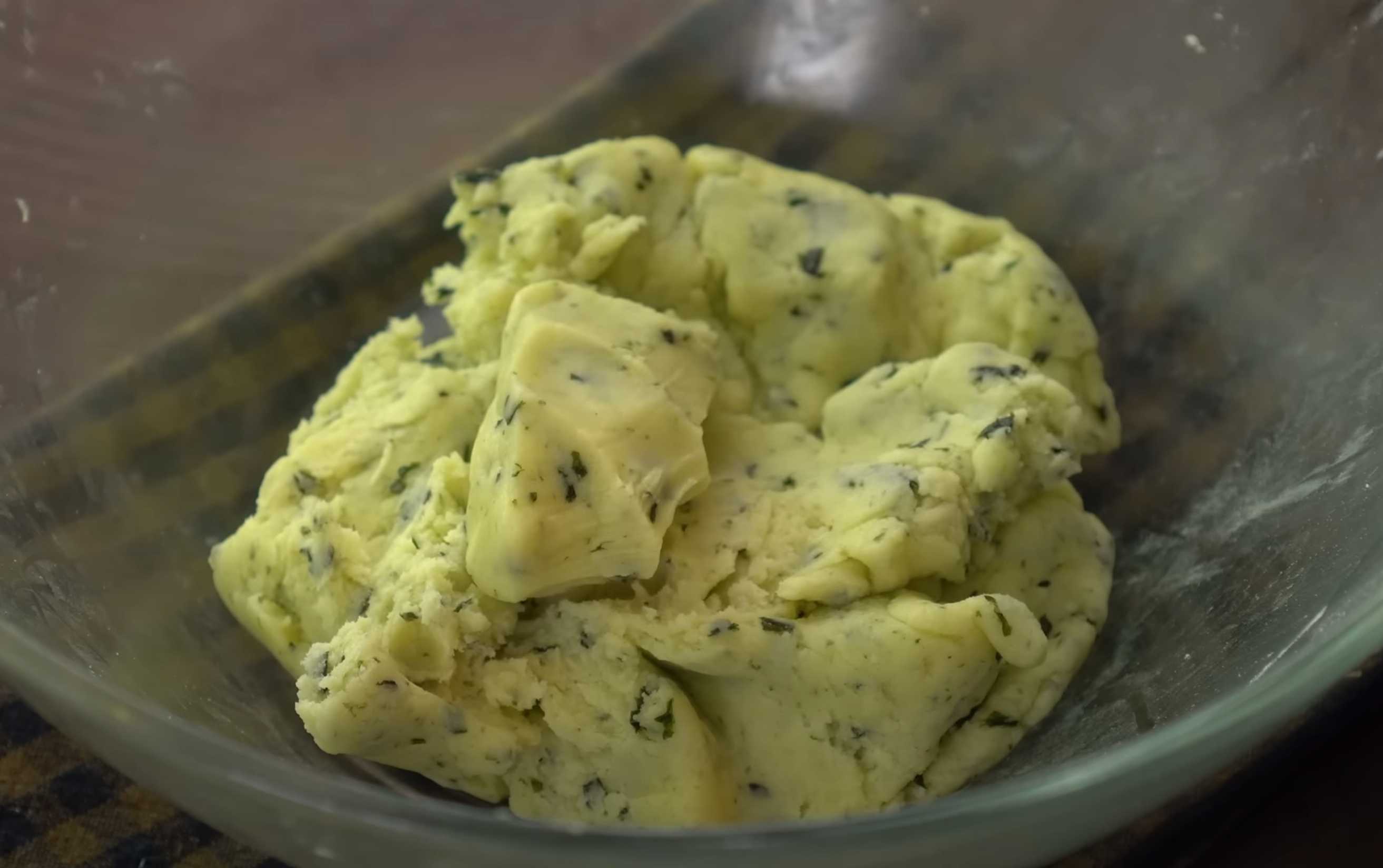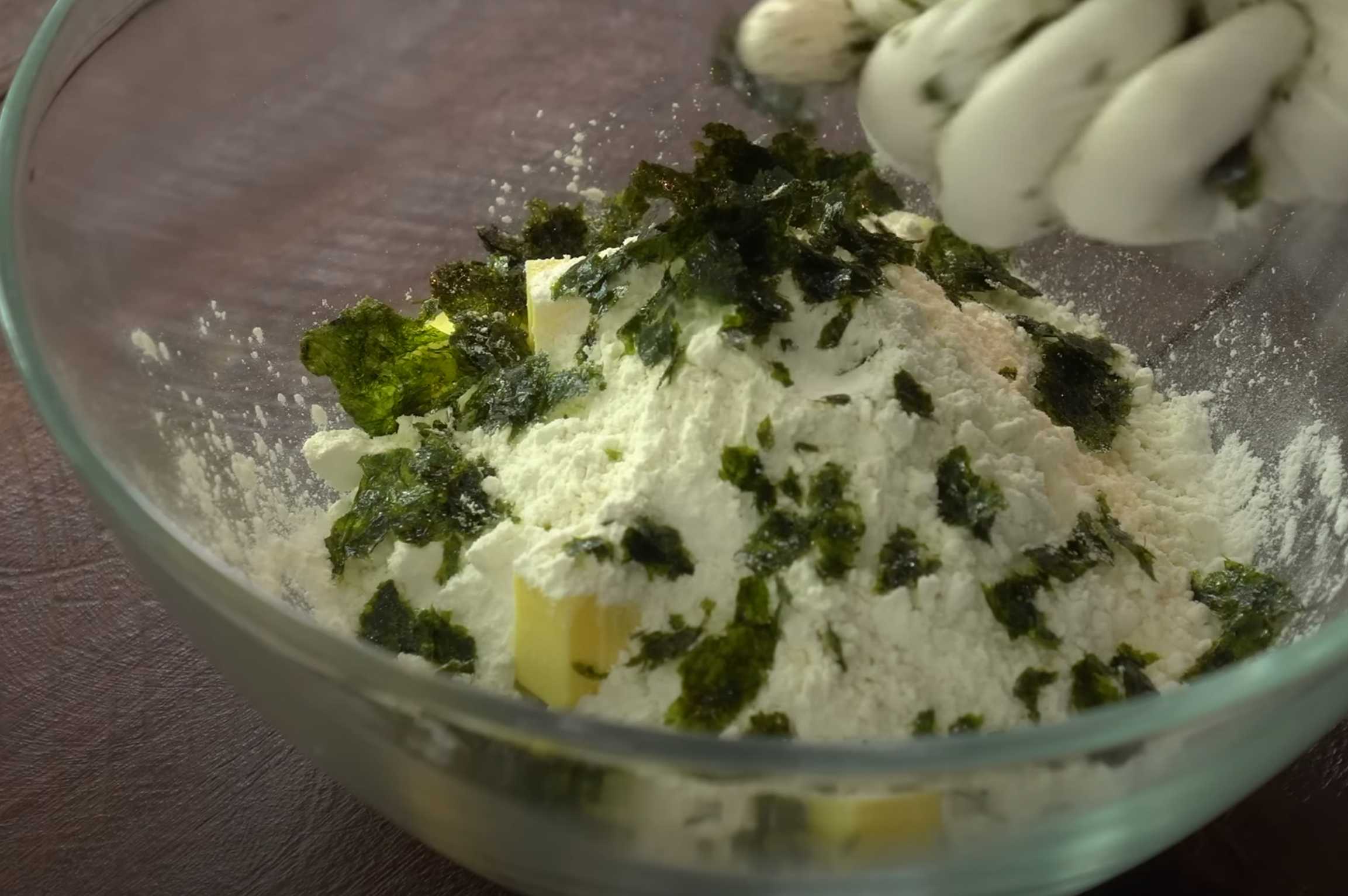 Placez la purée de pommes de terre dans un bol et ajoutez 60 grammes de beurre non salé, une cuillère à soupe de sucre, 2 pincées de sel, 60 grammes de fécule de maïs, 60 grammes de farine et des feuilles d'algues écrasées assaisonnées de sel et d'huile de sésame.