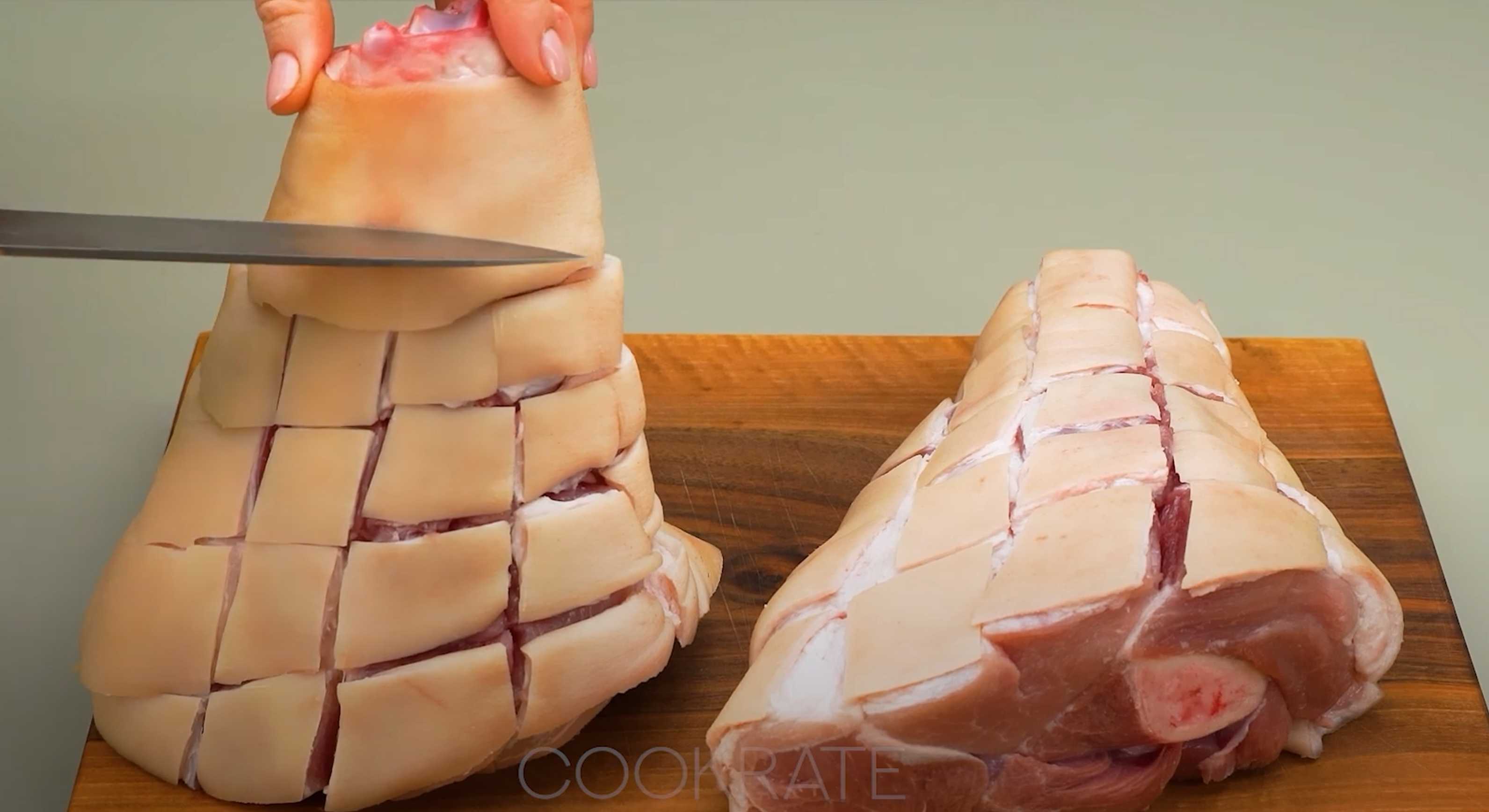 Découpez la couenne des jarrets de porc en carrés. Saupoudrez de sel.
